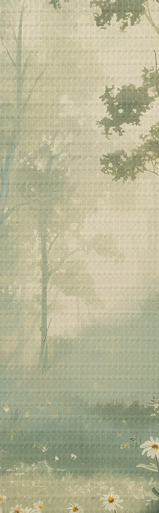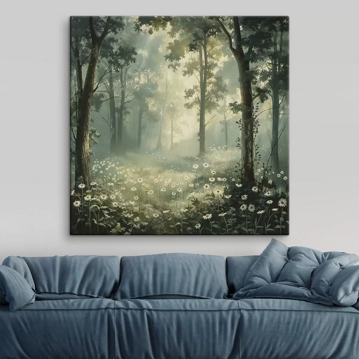 Obraz Las z miękkim światłem słonecznym, kwiaty rumianku, drzewa, zielona trawa, rysunek akrylowy Nr s40228