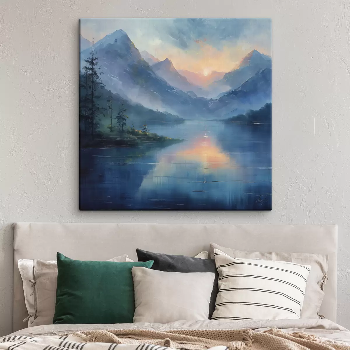 Obraz Zachód słońca w górach, mgła, rzeka, forest, obraz olejny Nr s40302