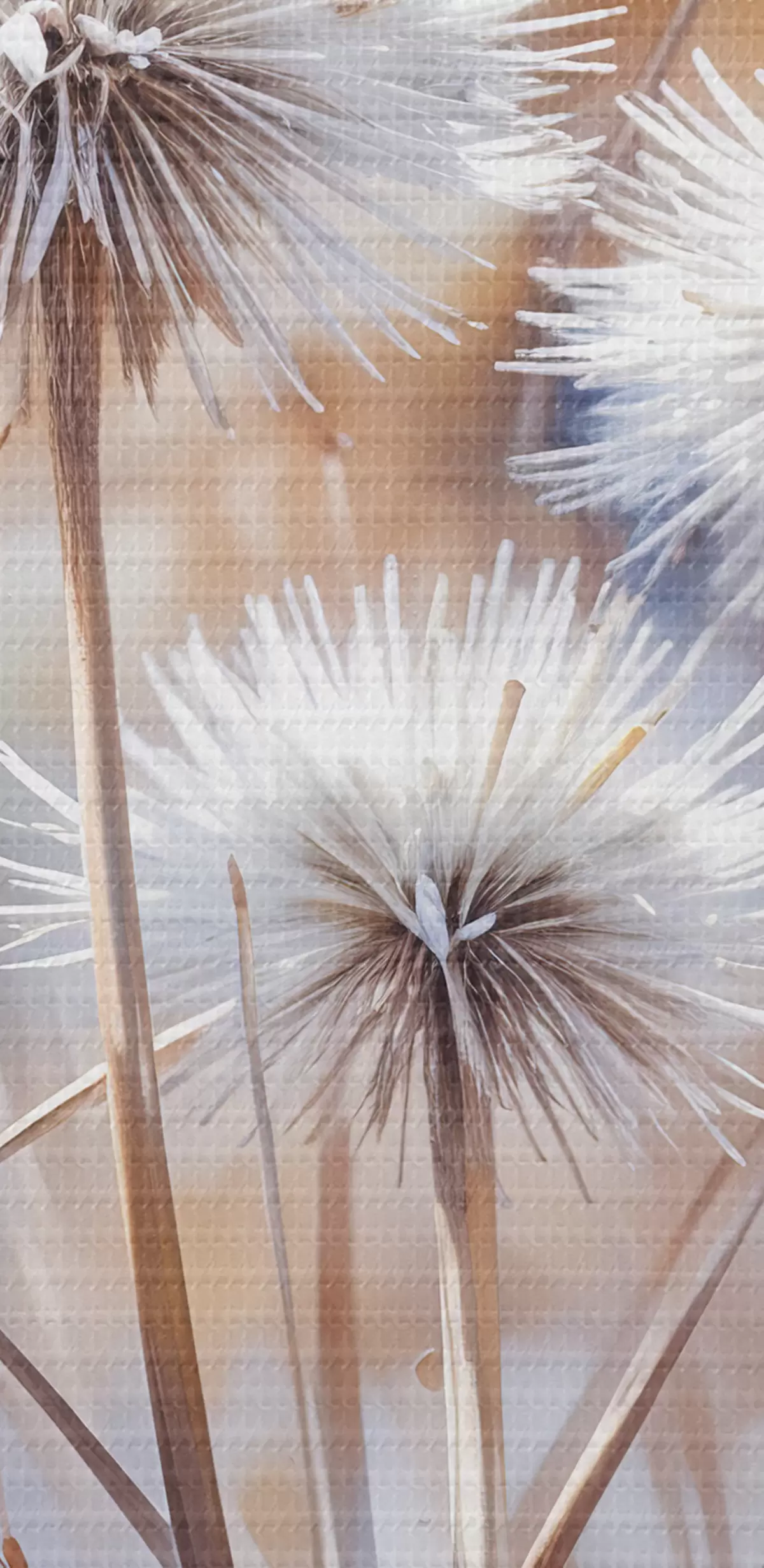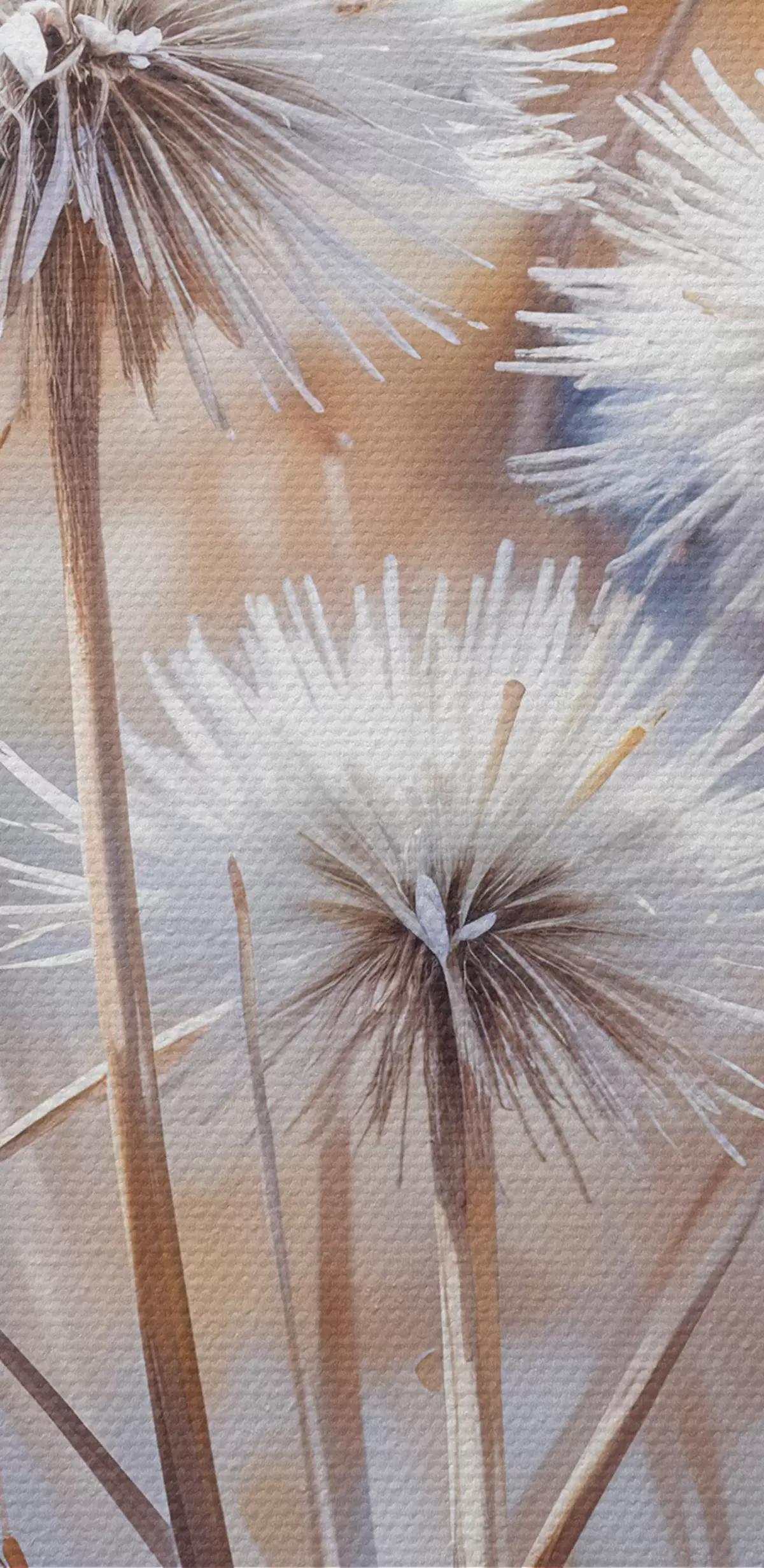 Obraz Puszyste, białe kwiaty mniszka lekarskiego na rozmytym tle akwareli z ciepłym oświetleniem Nr s40541
