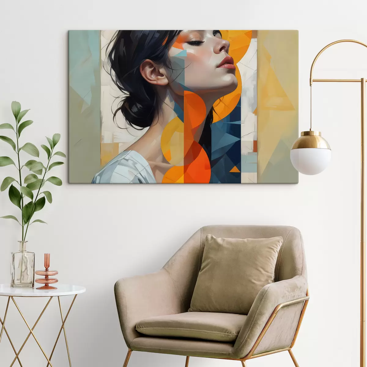 Obraz Abstrakcyjny obraz przedstawiający kobietę z długimi, ciemnymi włosami, ubraną w białą koszulę z kolorowym, geometrycznym nadrukiem Nr s40543