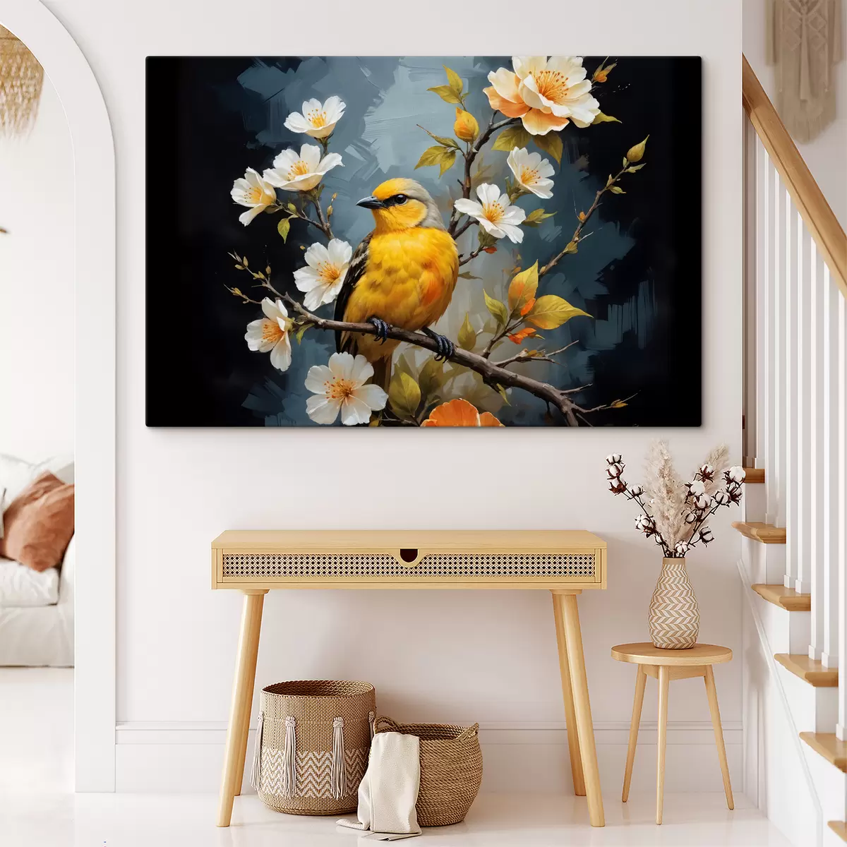 Obraz Żółty ptak siedzący na gałęzi z białymi i pomarańczowymi kwiatami w tle Nr s40550