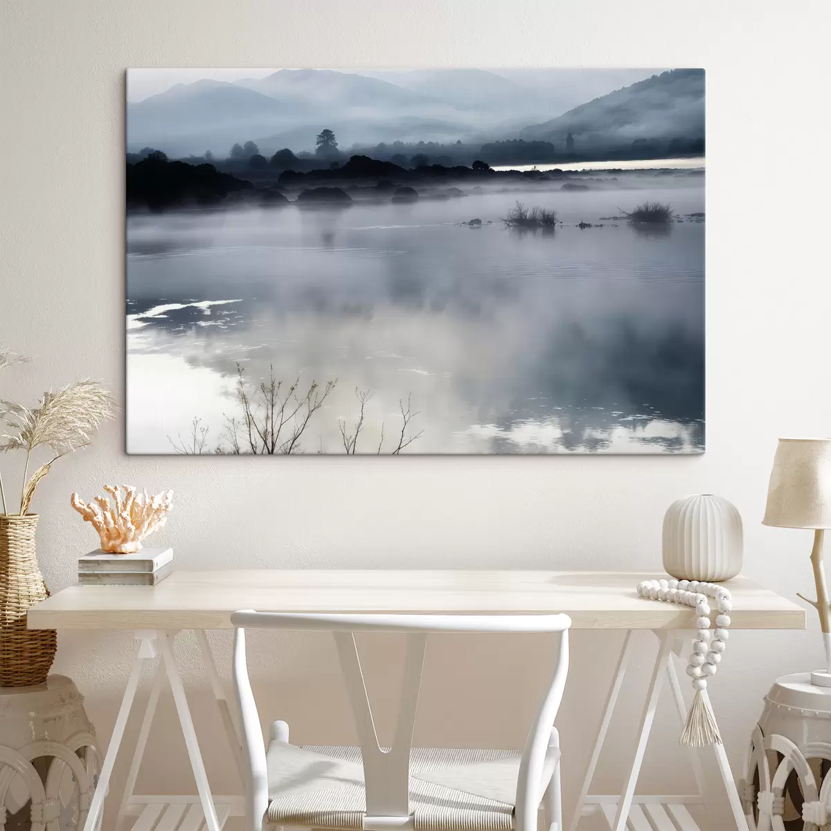 Obraz Mgliste jezioro otoczone sylwetkami wzgórz i drzew w tle, z spokojną, odbijającą powierzchnią Nr s40552
