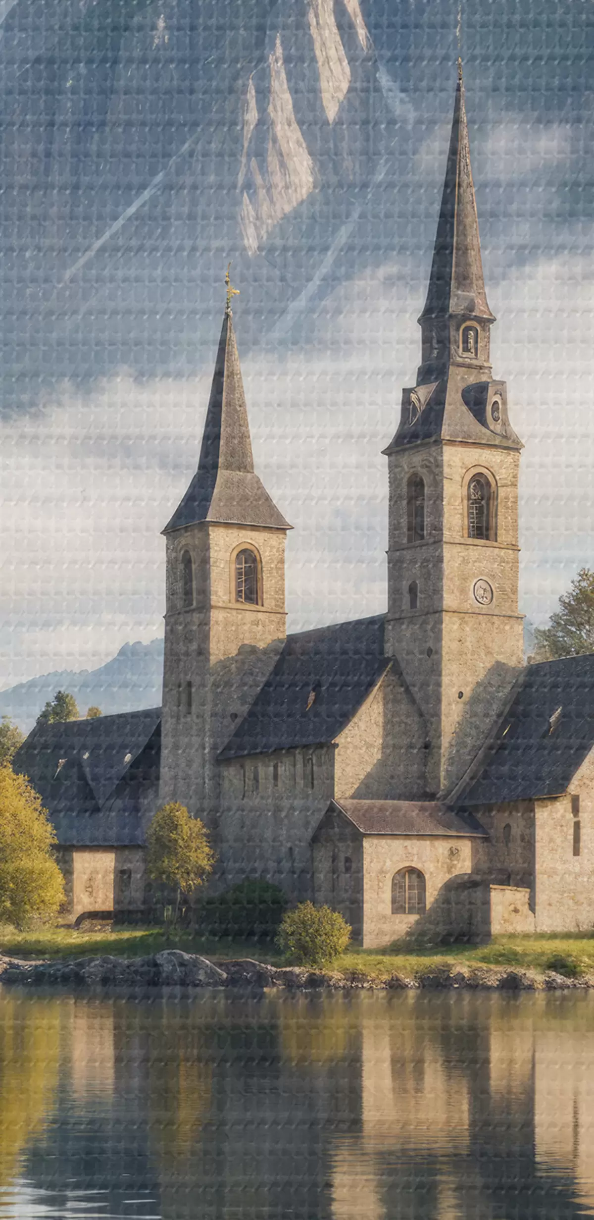 Obraz Malownicza alpejska wioska położona nad spokojnym jeziorem, z górującymi nad nią ośnieżonymi szczytami gór Nr s40554