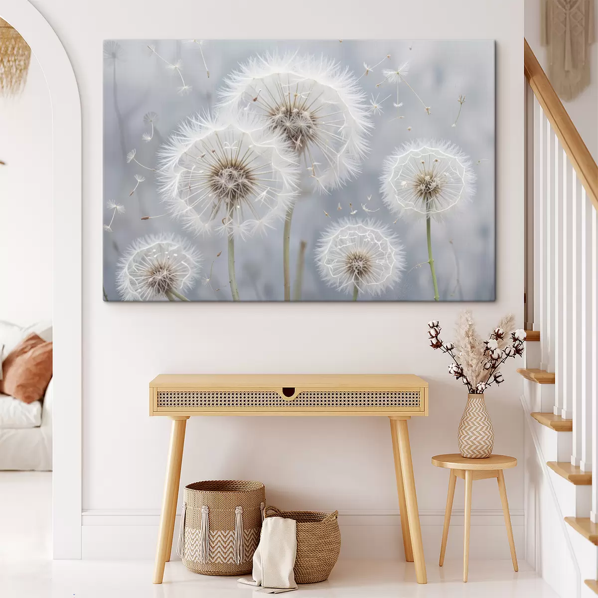 Obraz Białe kwiaty mniszka lekarskiego z puszystymi nasionami na rozmytym szarym tle Nr s40556