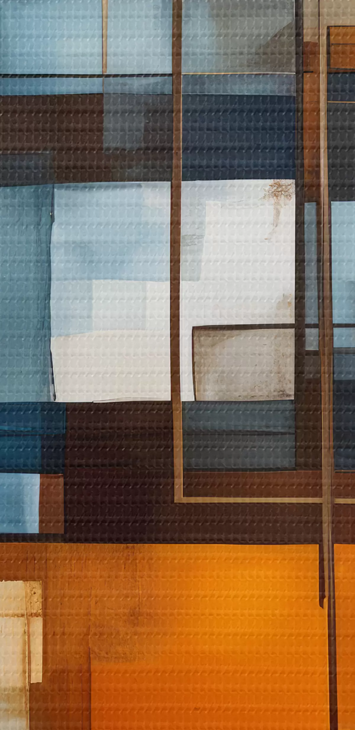 Obraz Abstrakcyjne kształty geometryczne w odcieniach niebieskiego, pomarańczowego i brązowego tworzą nowoczesną, minimalistyczną kompozycję Nr s40563