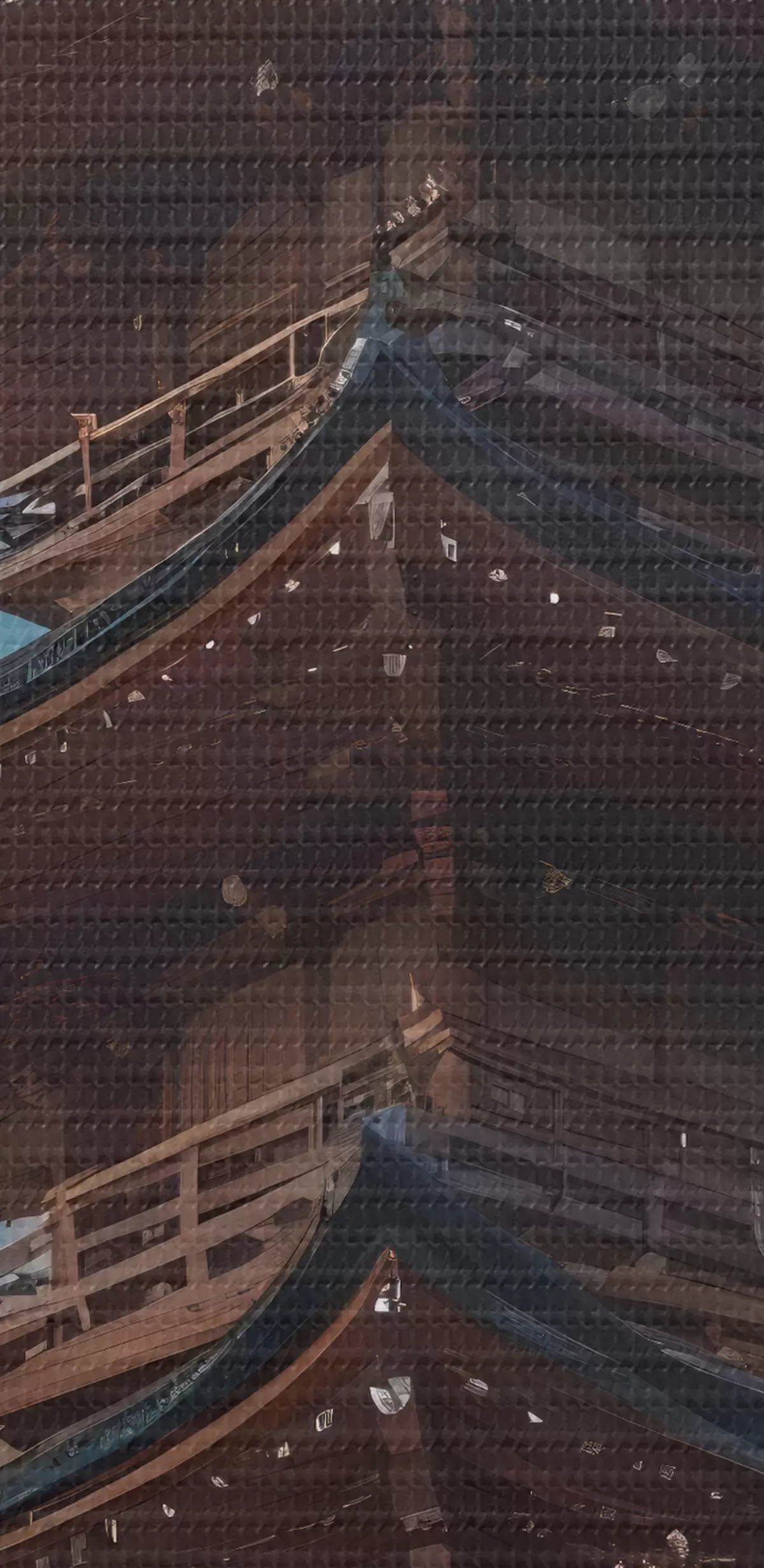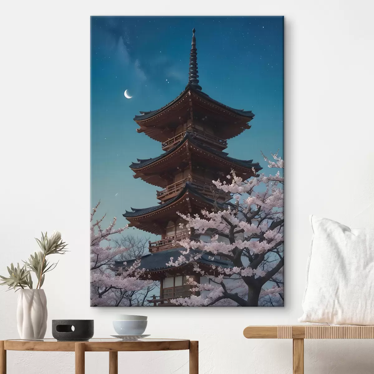 Obraz Tradycyjna japońska pagoda z półksiężycem na niebie i kwitnącymi drzewami wiśni Nr s40586