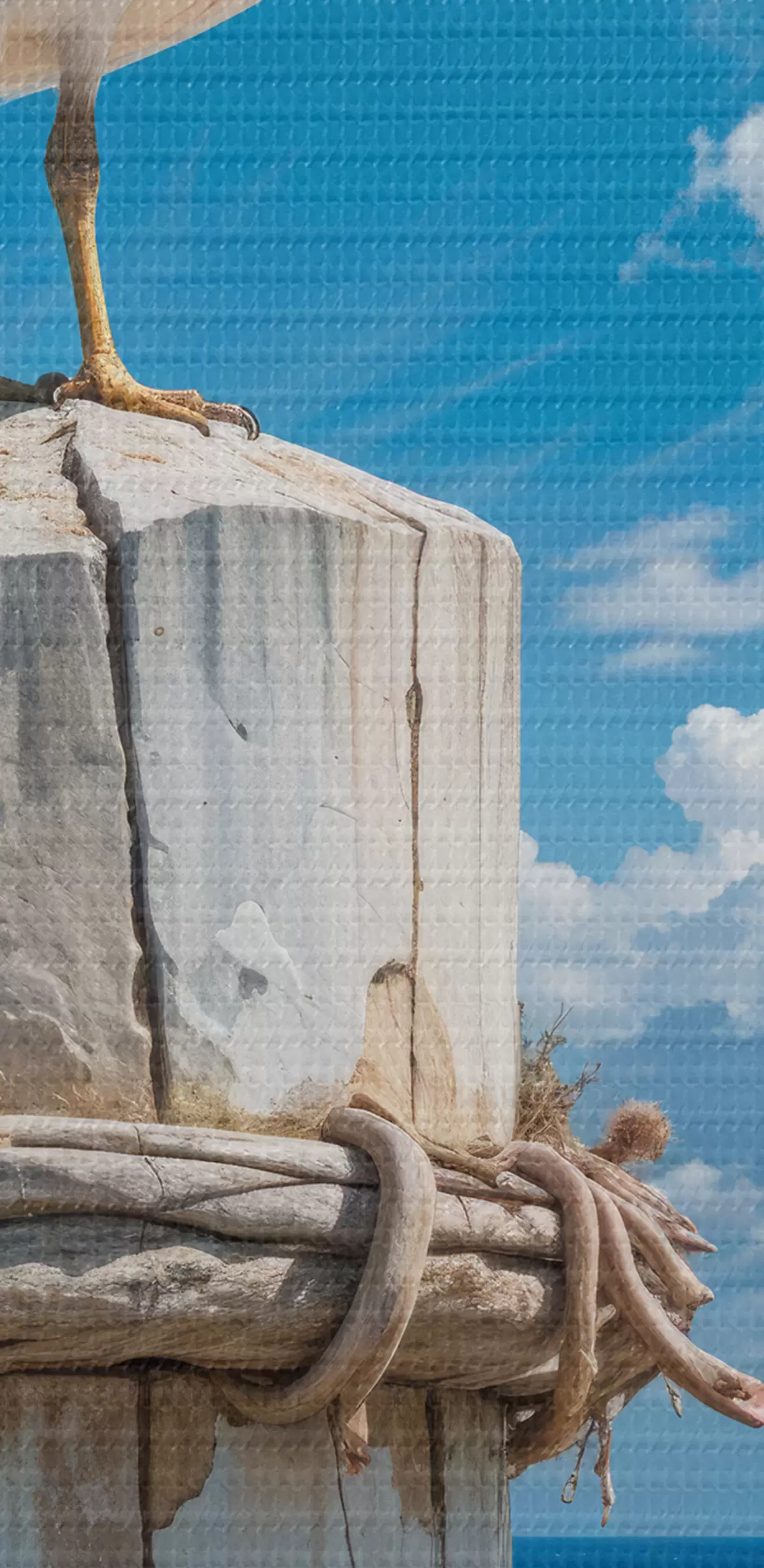 Obraz Biała mewa siedząca na drewnianym słupie na tle jasnoniebieskiego nieba i oceanu z falami Nr s40590