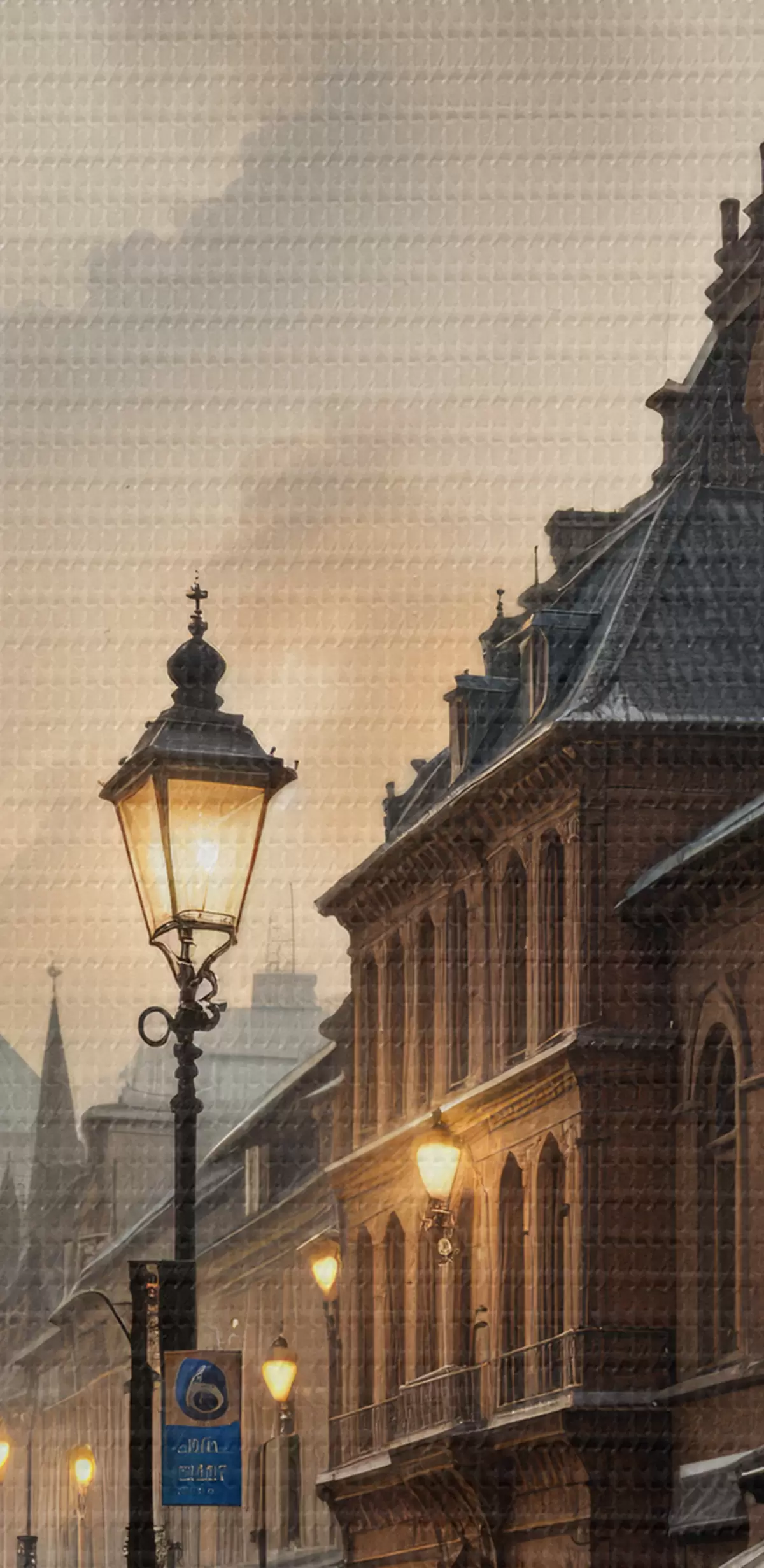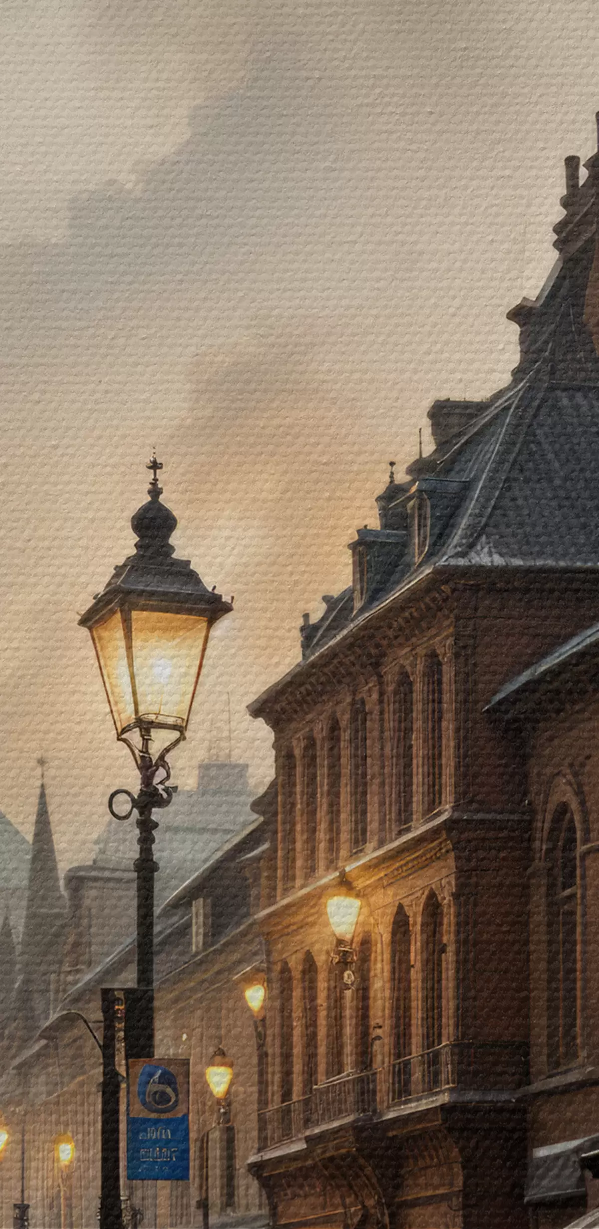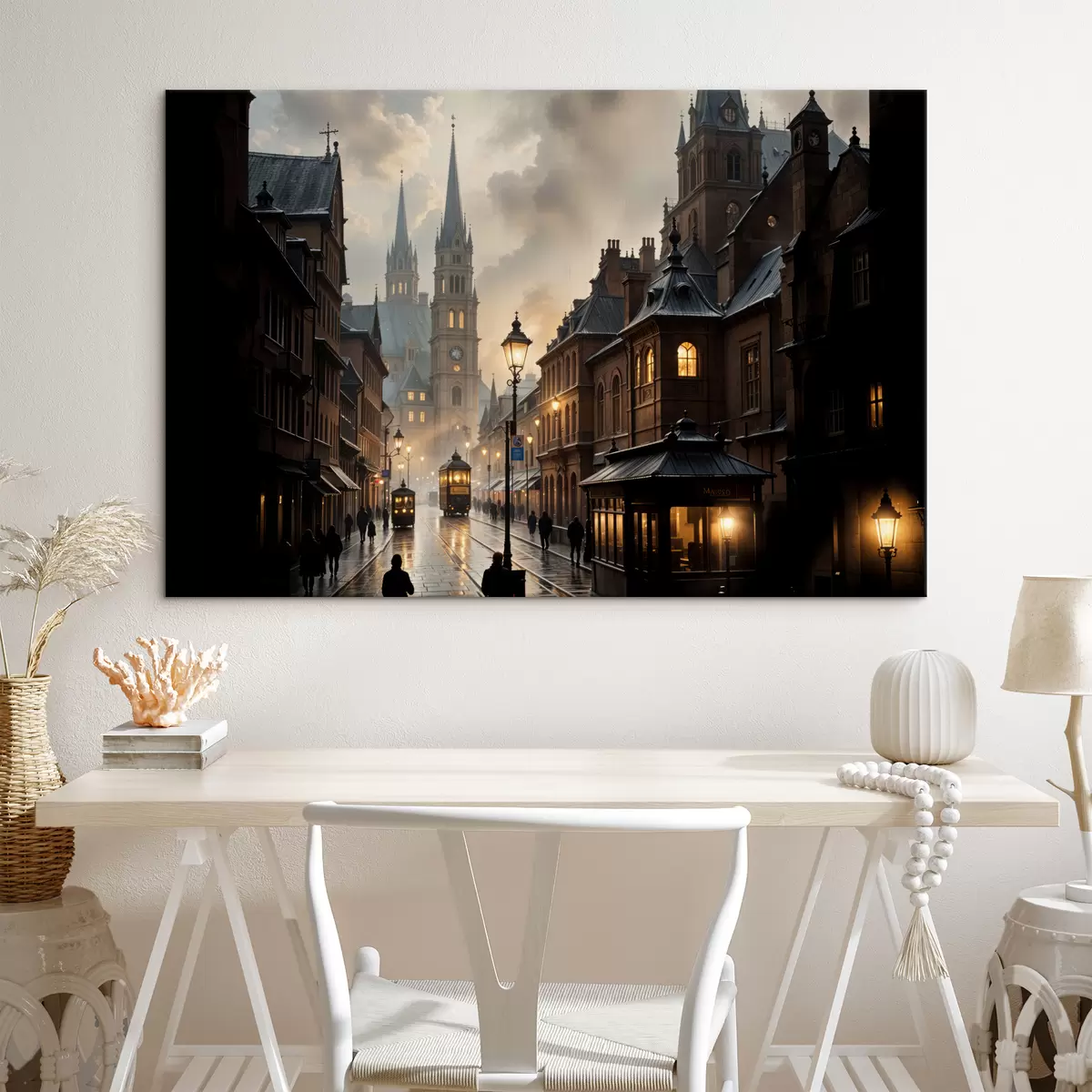 Obraz Deszczowy wieczór w starym europejskim mieście, z brukowanymi uliczkami, zabytkowymi budynkami i przejeżdżającym tramwajem Nr s40604