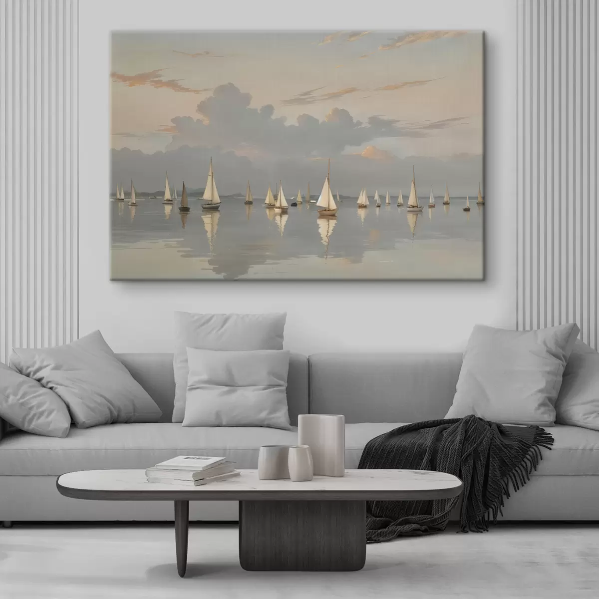 Obraz Flota białych żaglówek na spokojnym, odbijającym światło akwenie o zachodzie słońca, z zachmurzonym niebem w tle Nr s40615