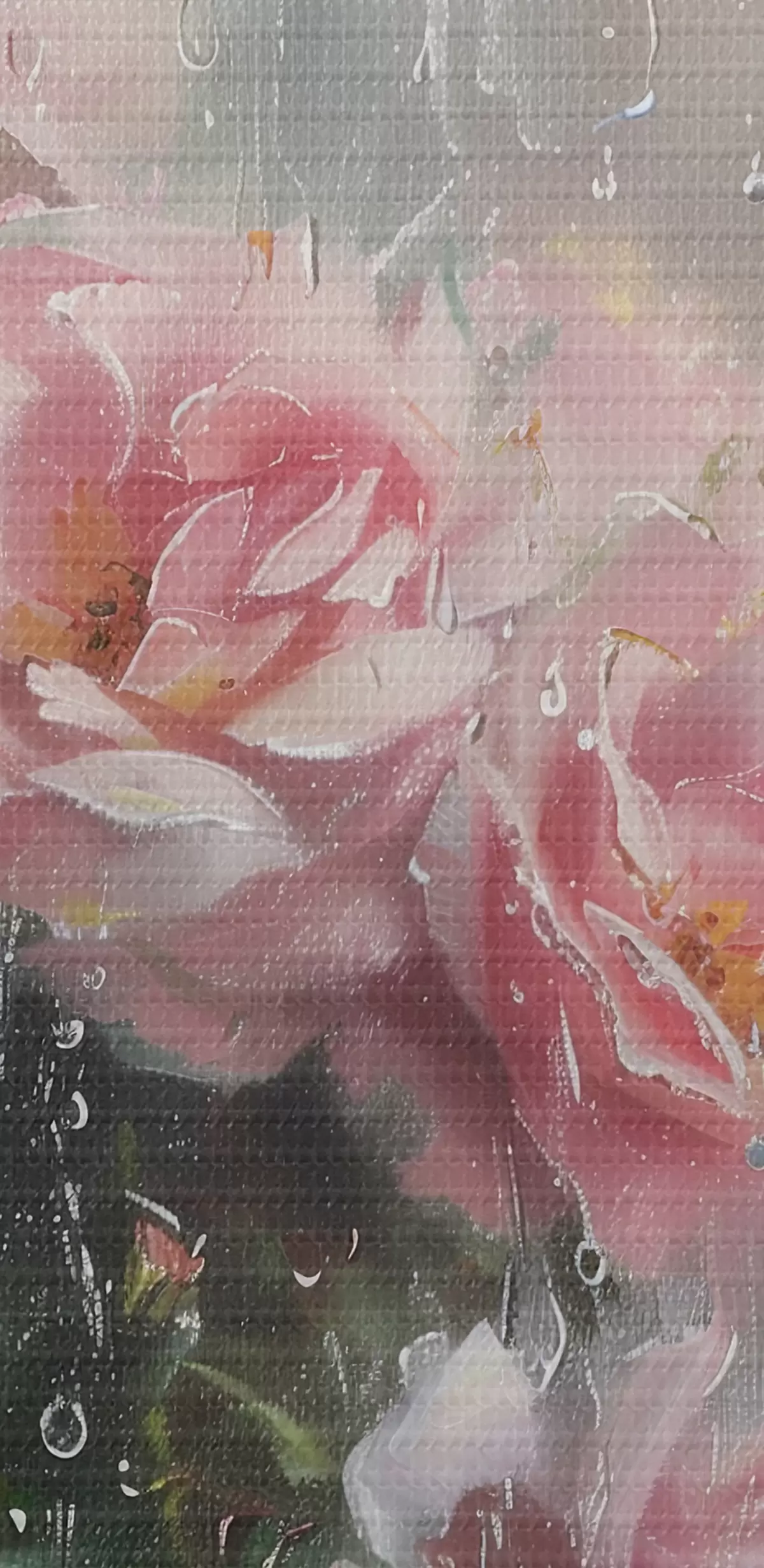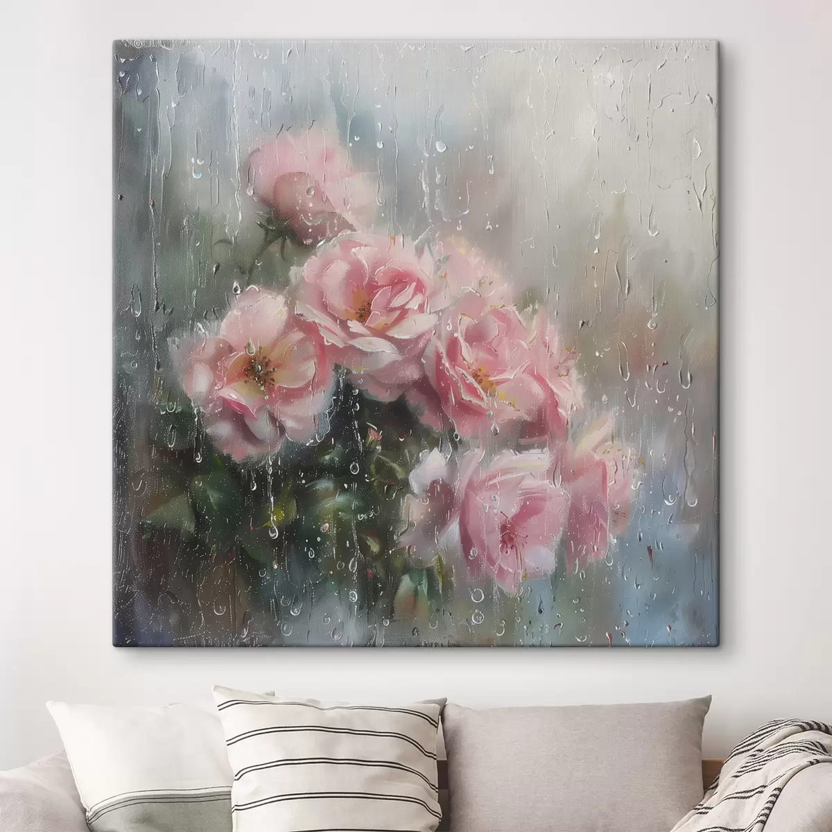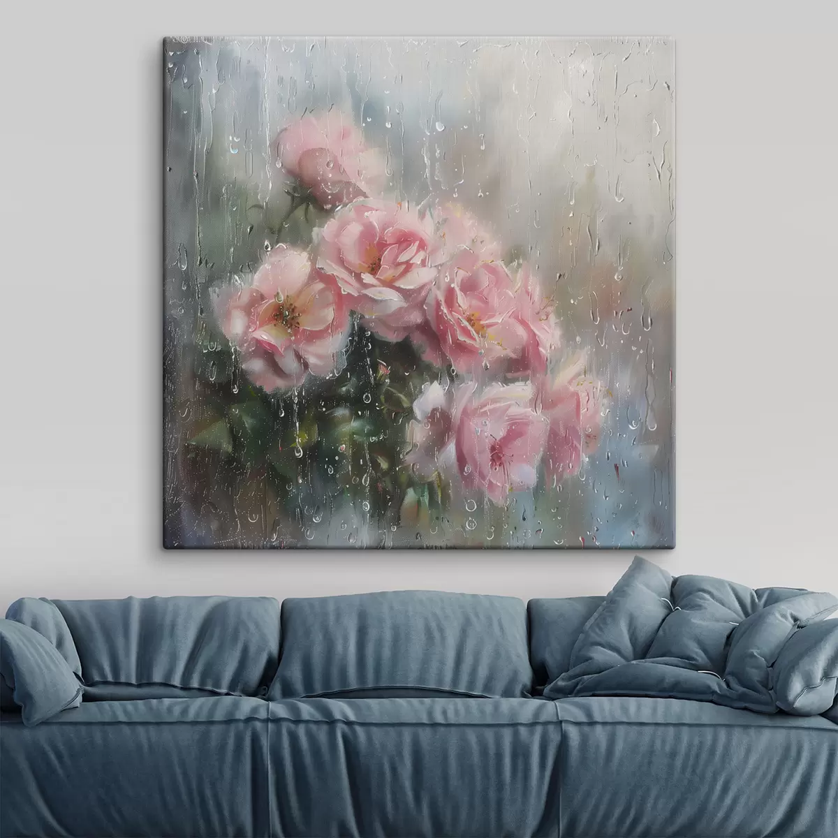 Obraz Bukiet różowych róż za oknem w deszczową pogodę Nr s40656
