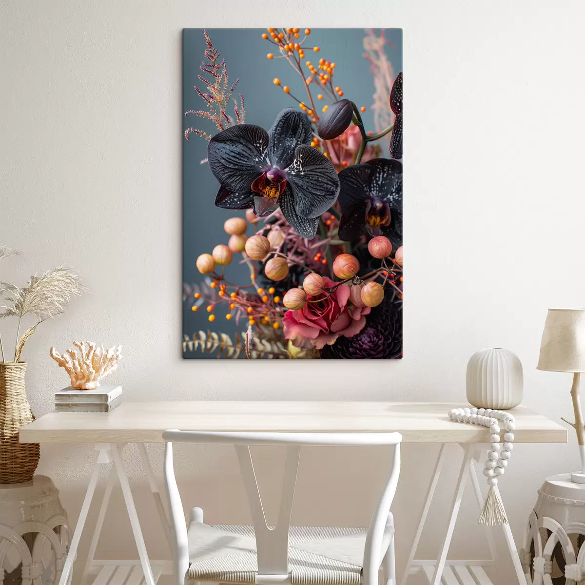 Obraz Elegancka kompozycja kwiatowa z czarnej orchidei i innych roślin Nr s40662