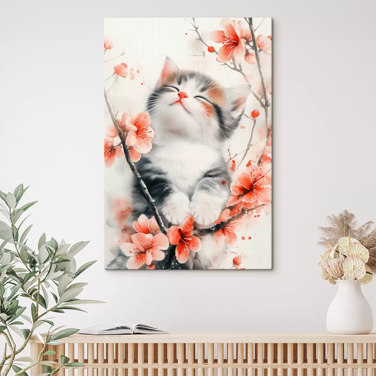 Obraz Śliczny kotek na gałęzi z kwiatami Nr s40734