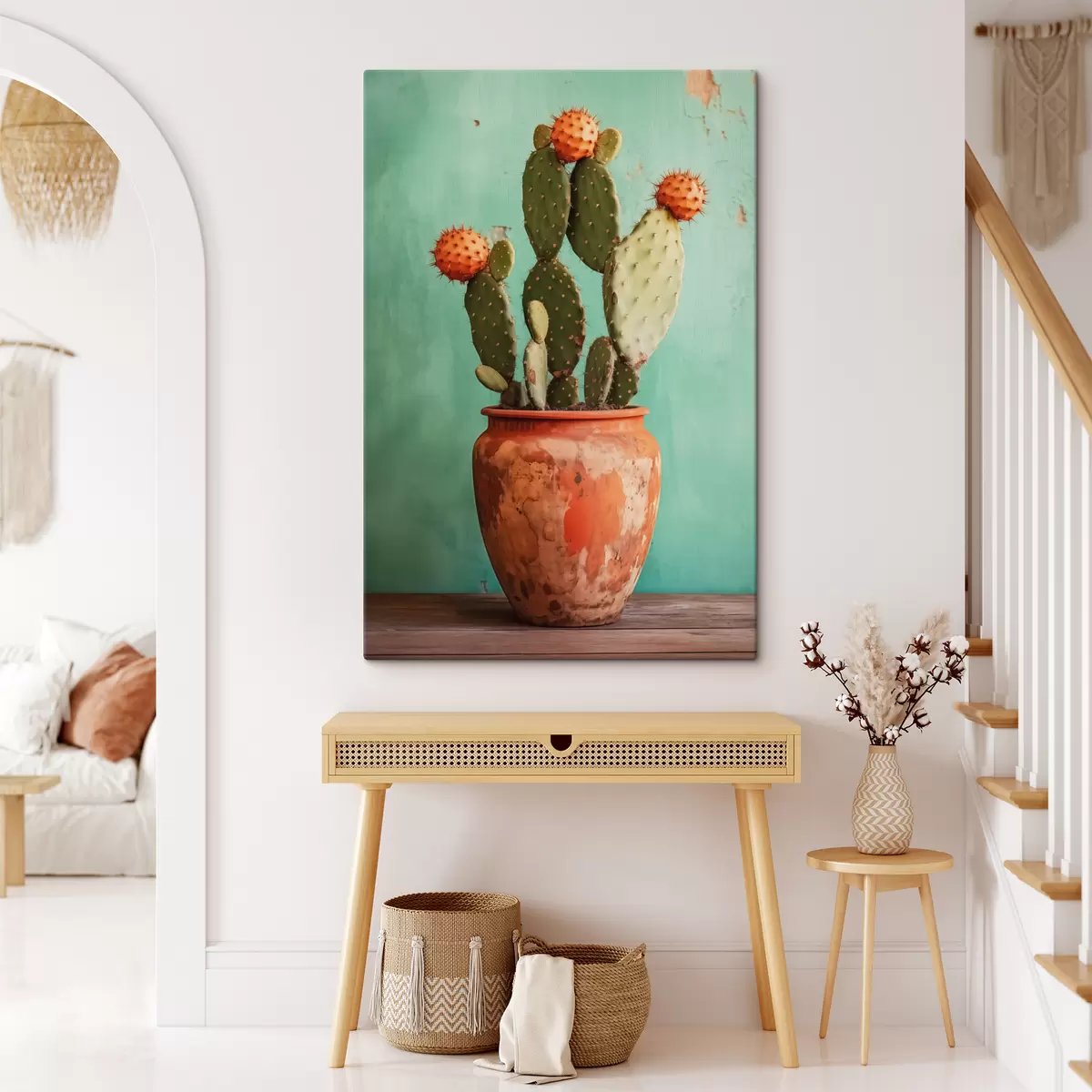 Obraz Kaktus w starej glinianej doniczce na tle niebiesko-zielonej ściany Nr s40807