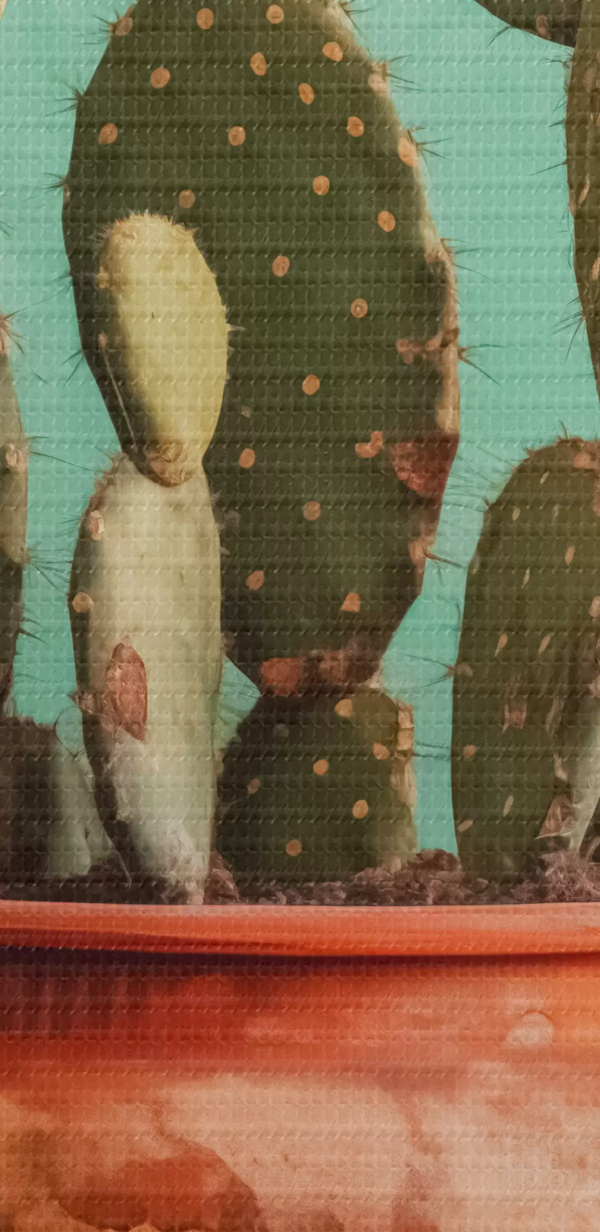 Obraz Kaktus w starej glinianej doniczce na tle niebiesko-zielonej ściany s40807
