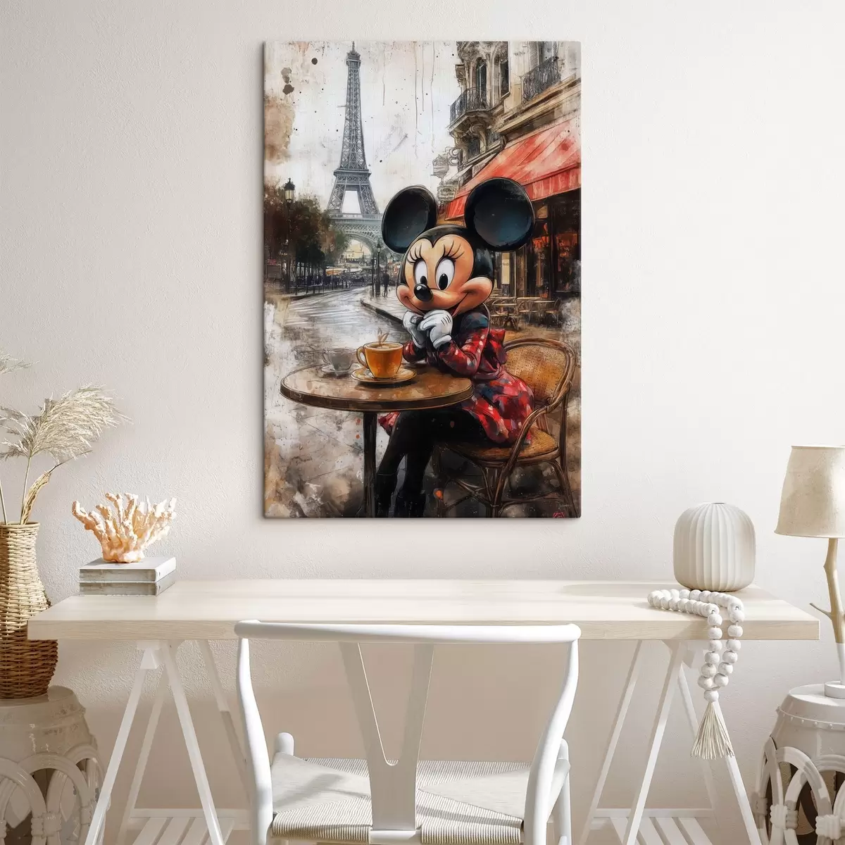 Obraz Dziewczynka z Myszką Miki pijąca kawę na tle wieży Eiffla w Paryżu s40972