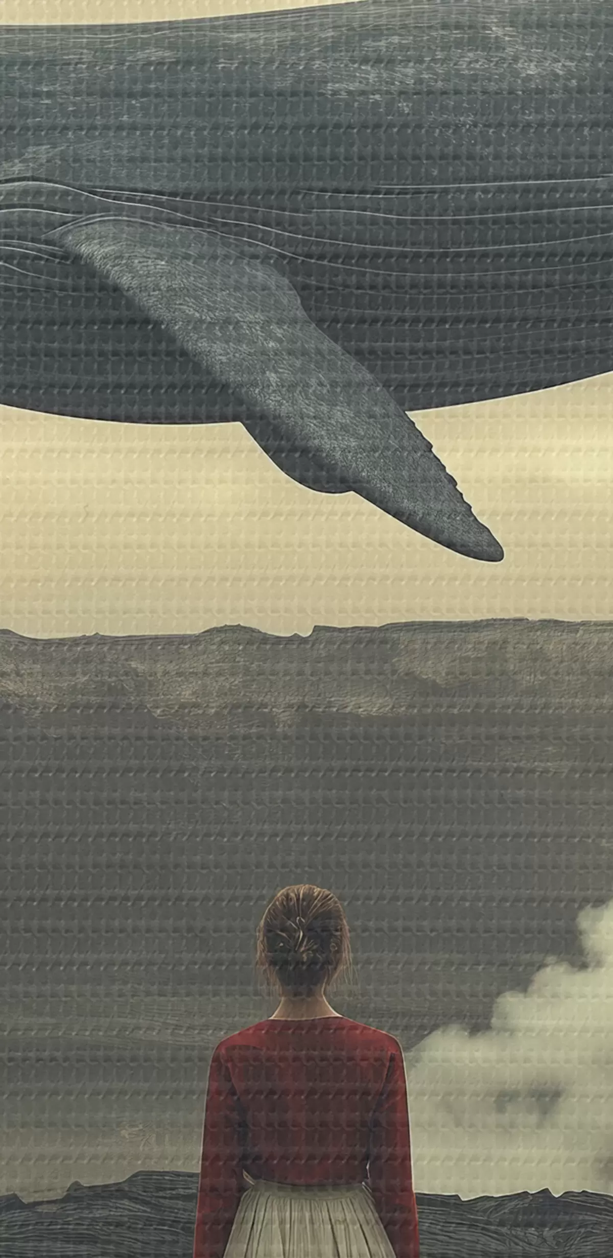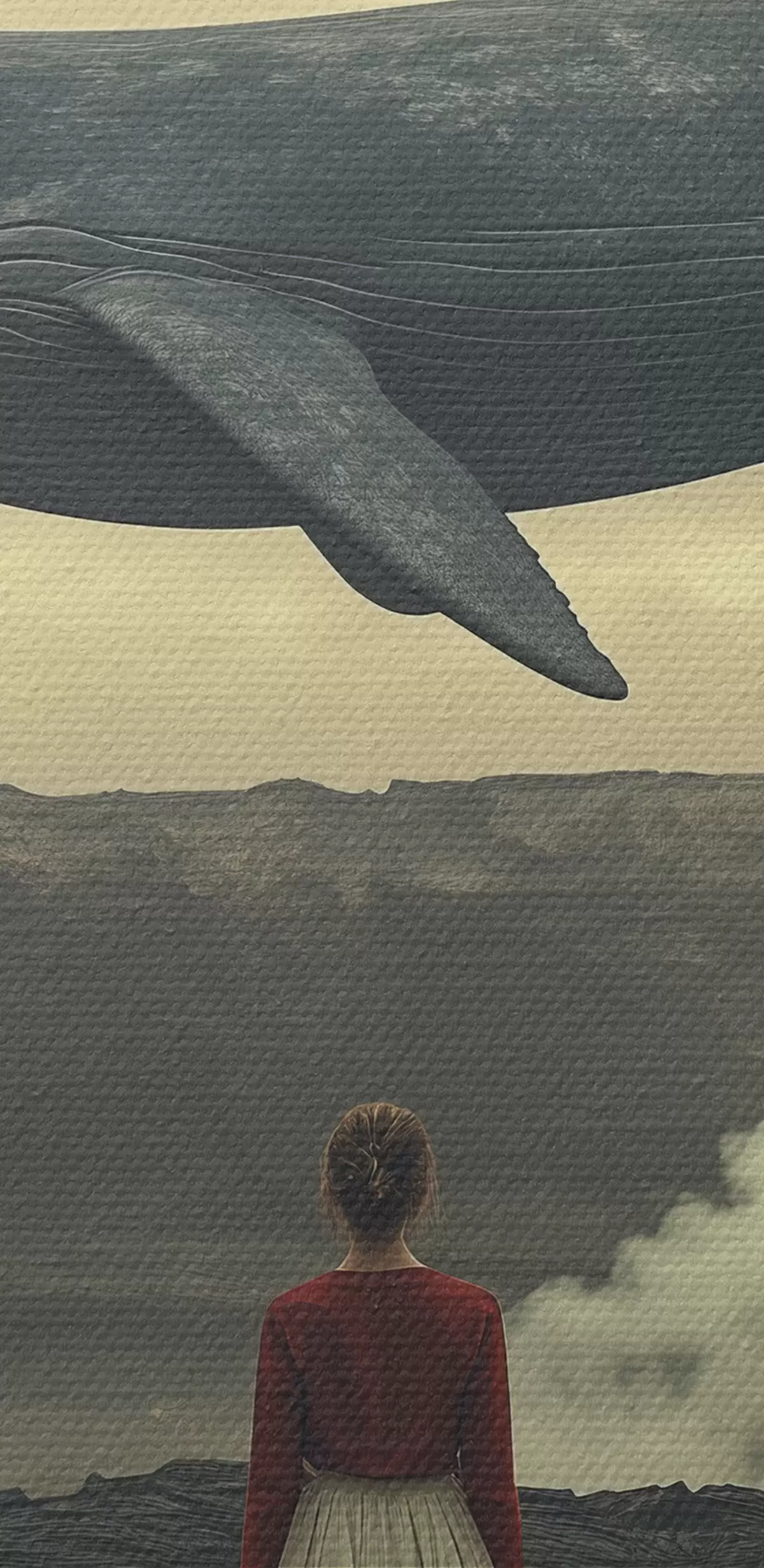 Obraz Dziewczyna na lawie z dużym latającym wielorybem na niebie Nr s40986