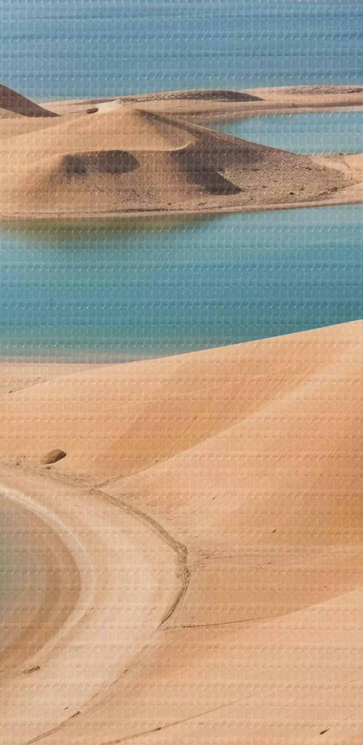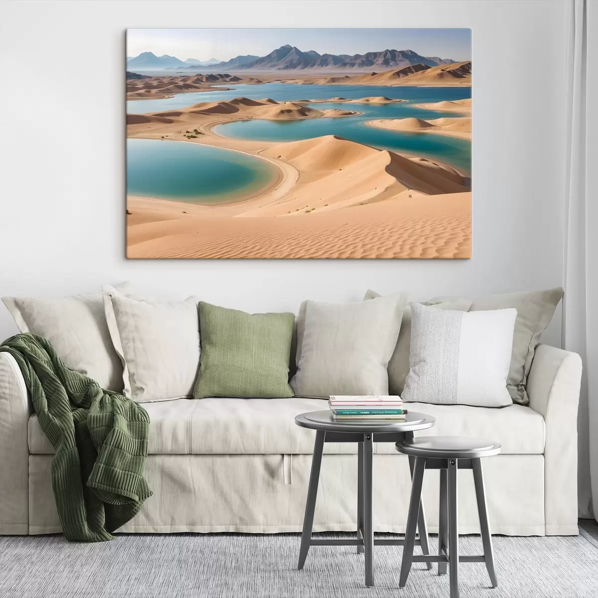 Obraz Rozległy pustynny krajobraz z falującymi wydmami i turkusowymi jeziorami, otoczony surowymi górami Nr s41087