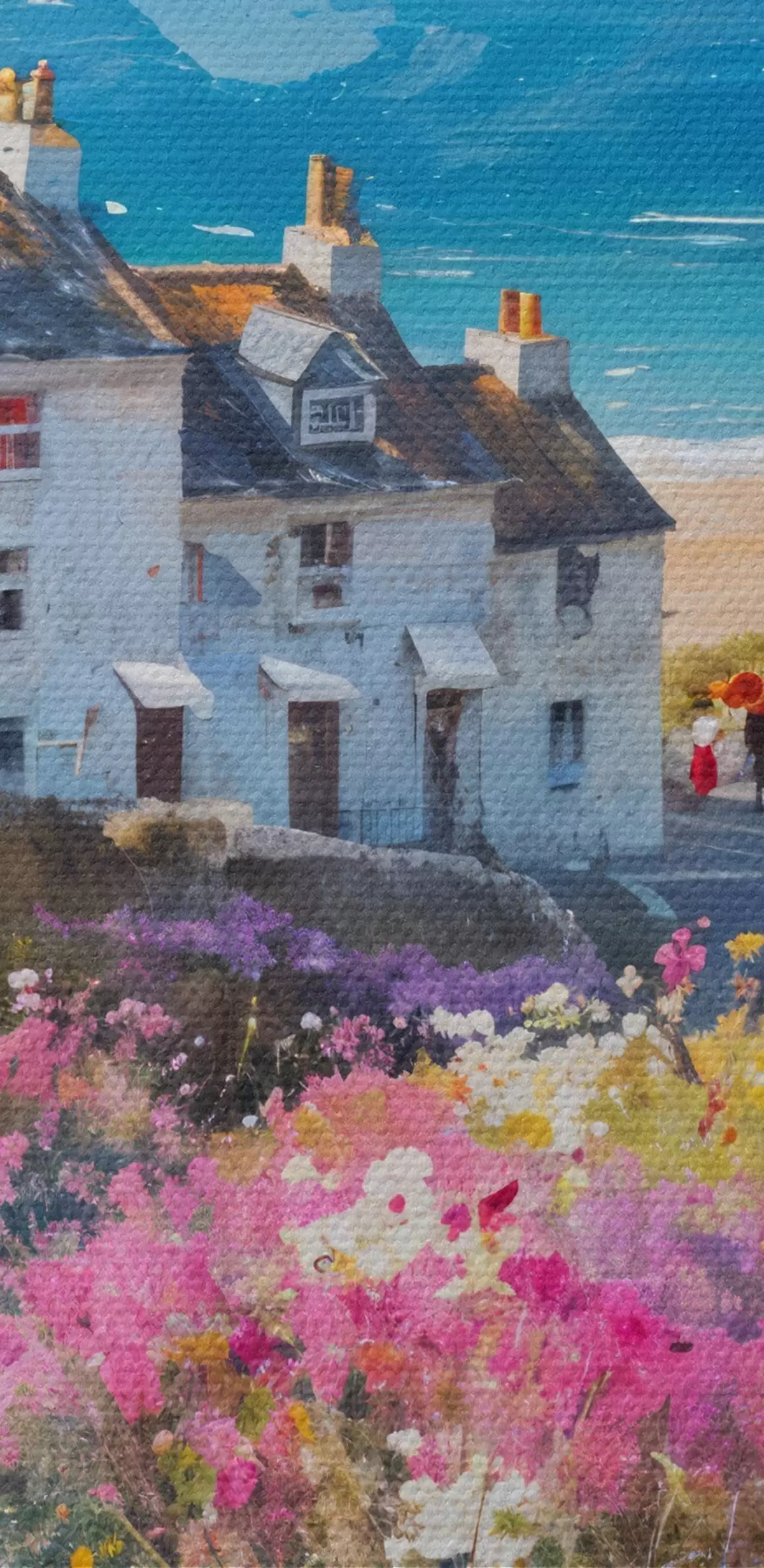 Obraz Kolorowy obraz olejny przedstawiający nadmorskie miasteczko z białymi domami i tętniącym życiem ogrodem kwiatowym na pierwszym planie Nr s41090