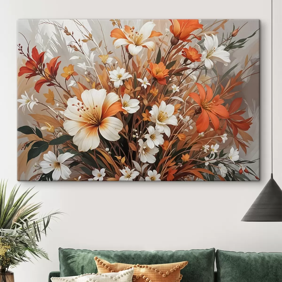 Obraz Żywy bukiet pomarańczowych i białych kwiatów, w tym lilii i innych delikatnych kwiatów s41099