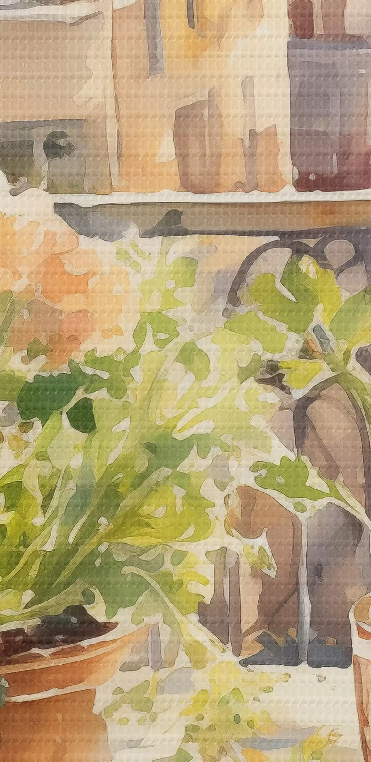 Obraz Akwarela kolacja, widok na miasto, kwiaty, natura, zielona sałatka Nr s41166