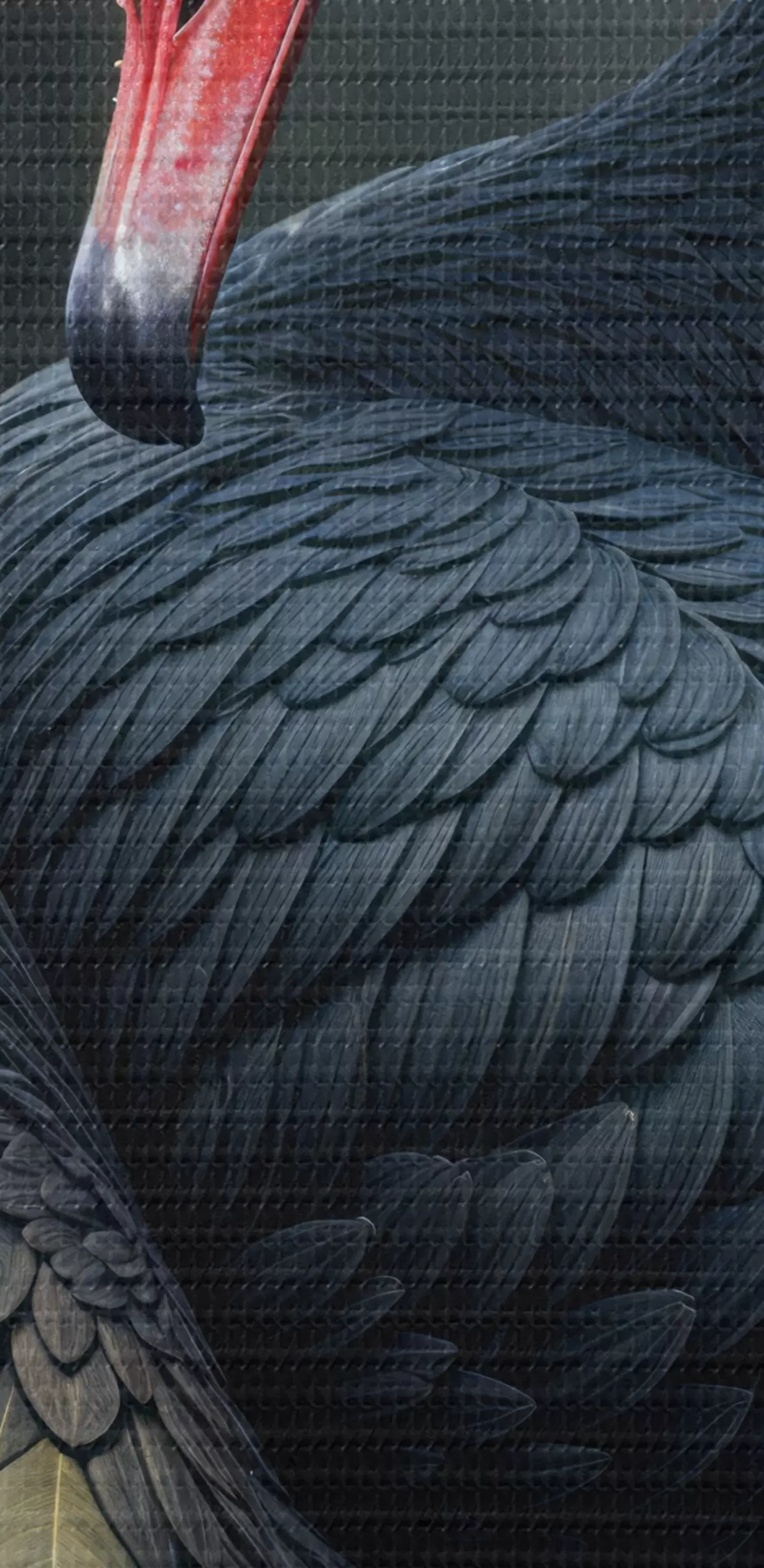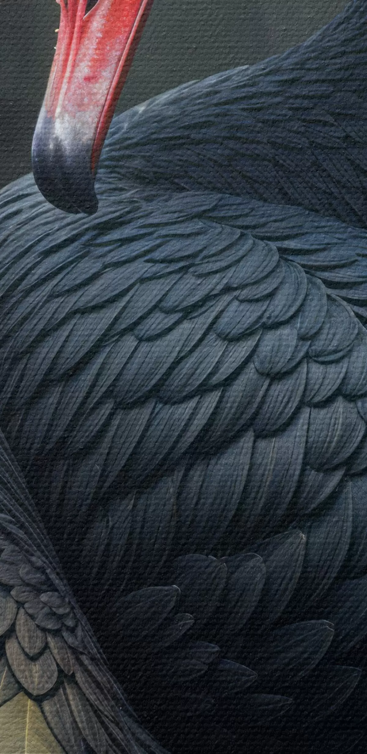 Obraz Czarny łabędź z rozpostartymi skrzydłami, prezentujący swoje czarne pióra i czerwony dziób na ciemnym tle Nr s41249