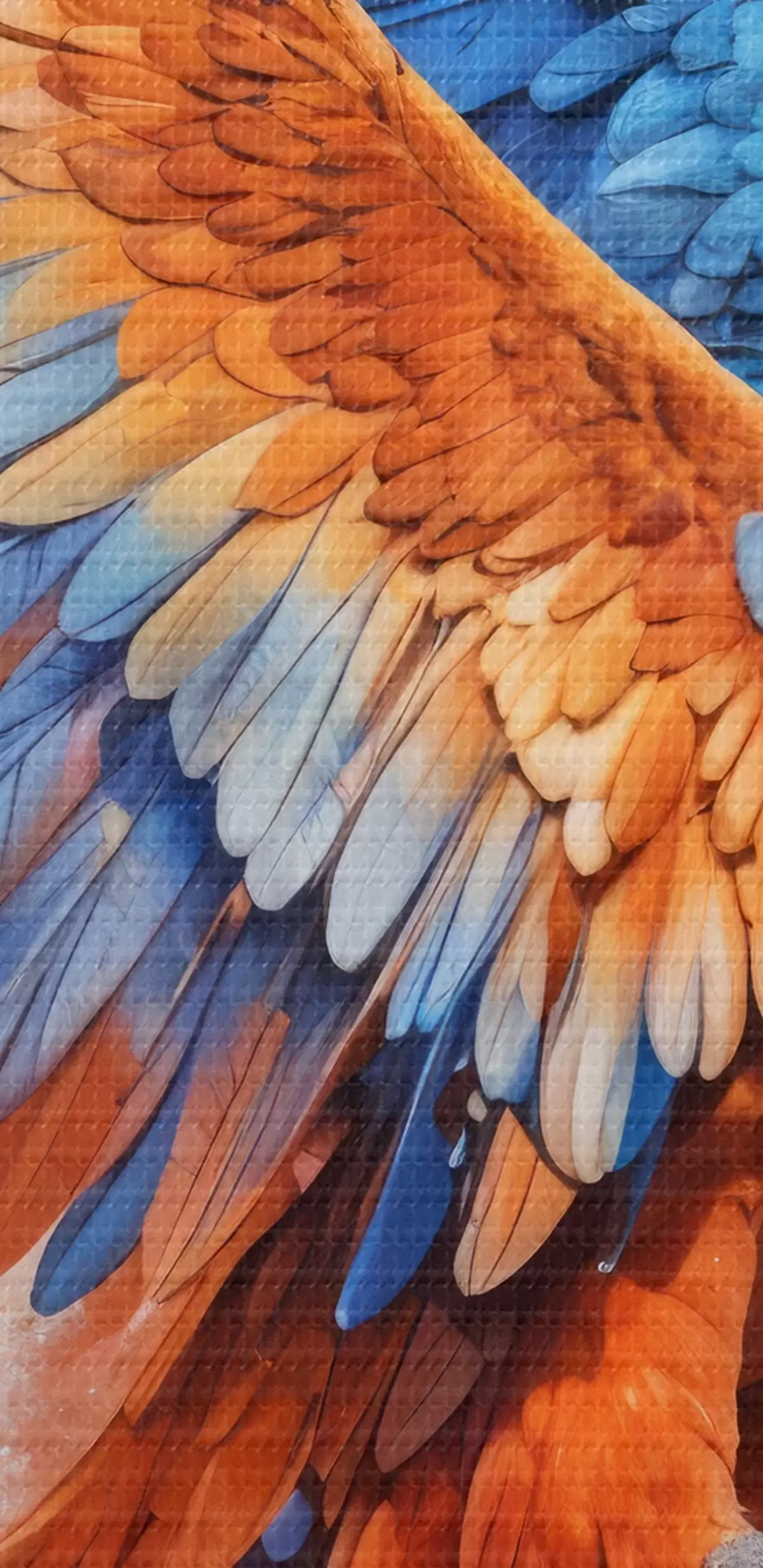 Obraz Kolorowa papuga z żywymi niebieskimi, pomarańczowymi i żółtymi piórami w locie na rozpryskującym się tle Nr s41250