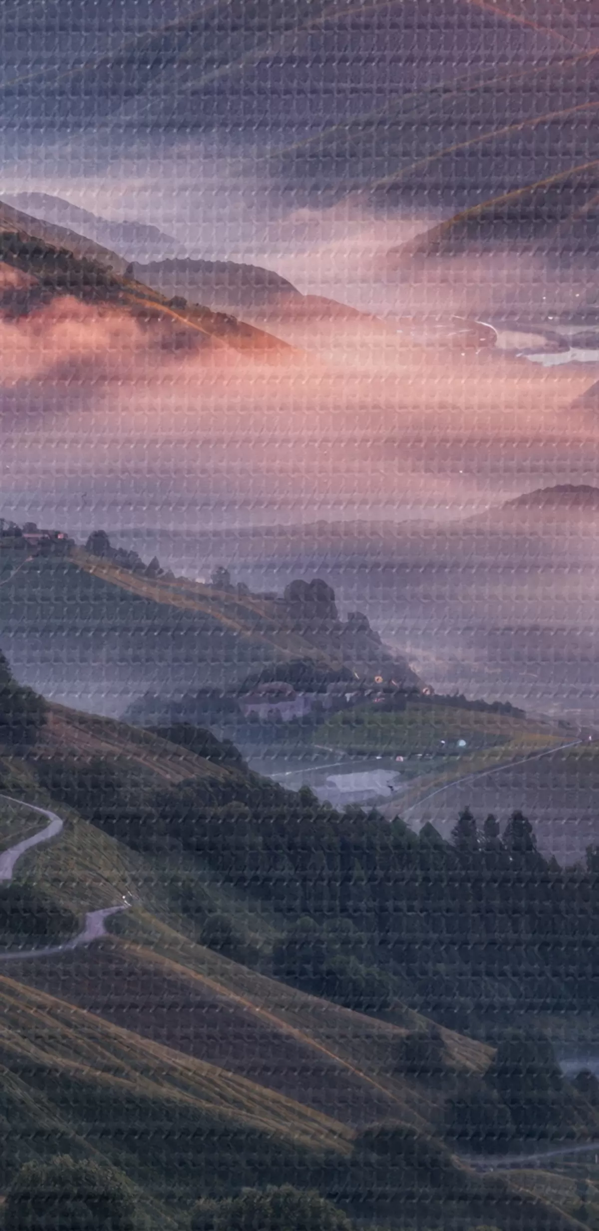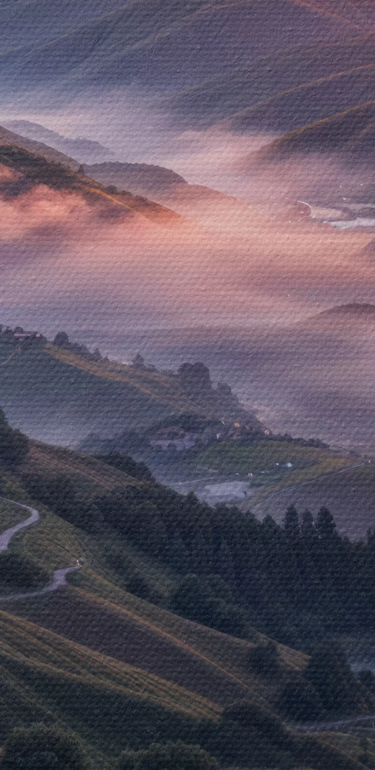 Obraz Zapierający dech w piersiach krajobraz z żywym zachodem słońca nad górzystym regionem z kępami różowych kwiatów Nr s41263