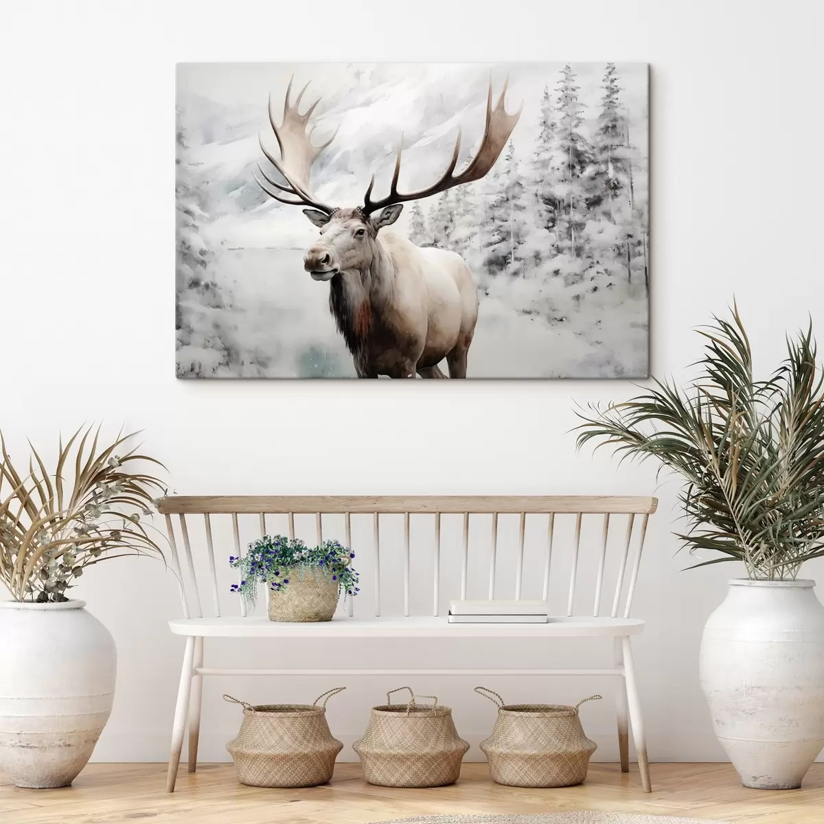 Obraz Łoś na tle zimowego lasu w śnieżnej akwareli s41284