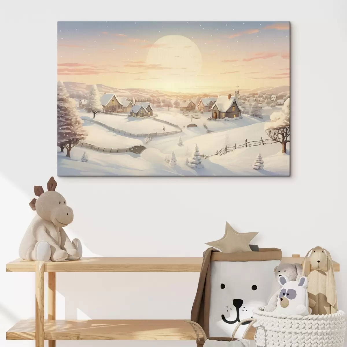Obraz Zimowa wioska o zachodzie słońca, domy pokryte śniegiem, sosny Nr s41380
