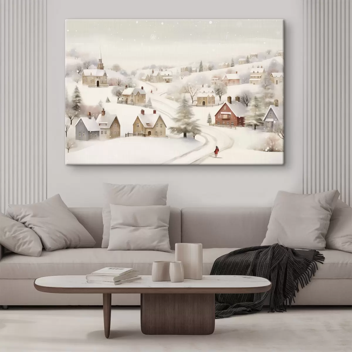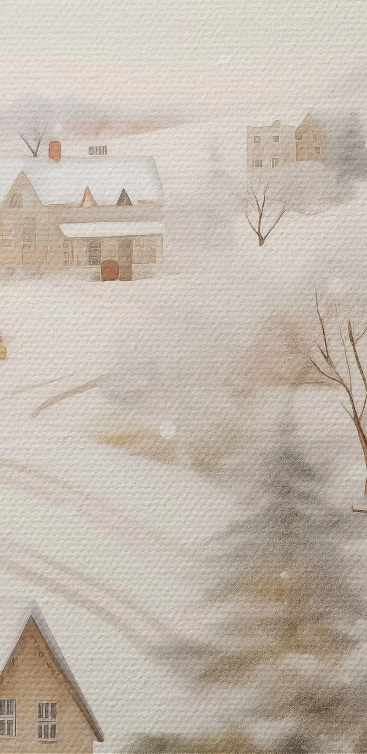 Obraz Zimowa wioska, akwarela, płatki śniegu, delikatne kolory, drzewa, krajobraz Nr s41381
