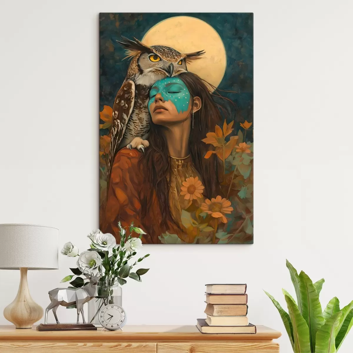 Obraz Kobieta z sową, styl plemienny, pełnia księżyca, kwiaty Nr s41444