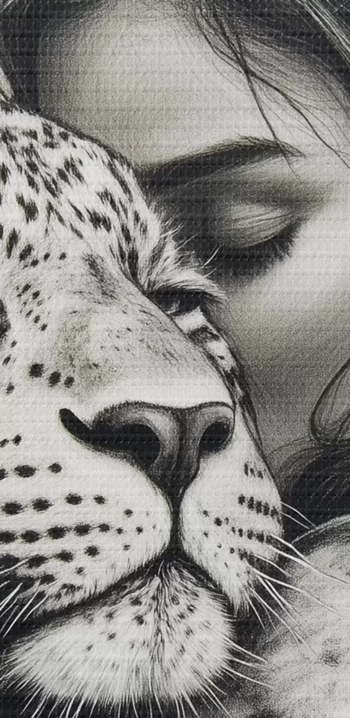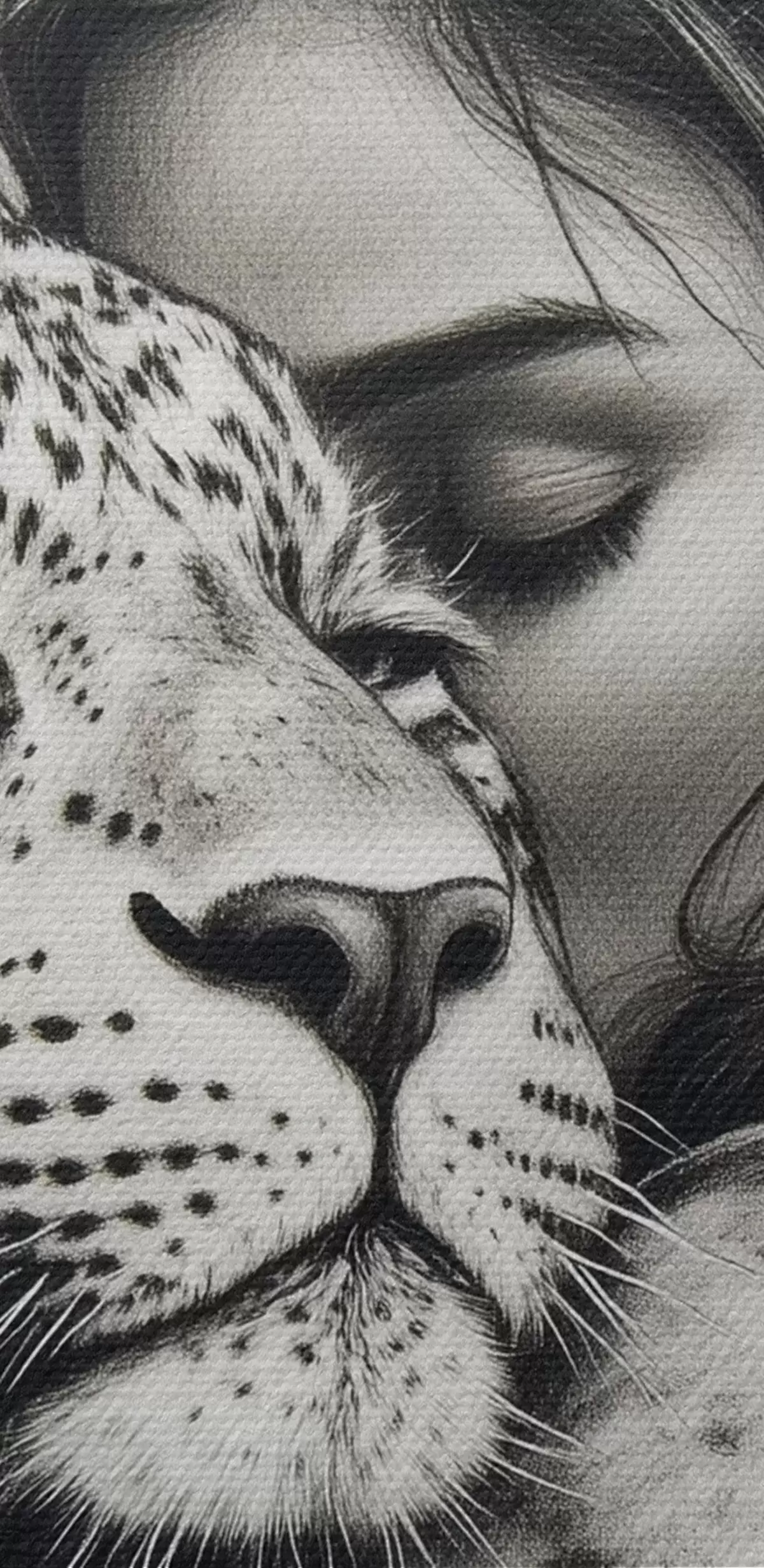 Obraz Kobieta z lampartem, dzikie zwierzęta, rysunek ołówkiem, czarno-biały Nr s41455