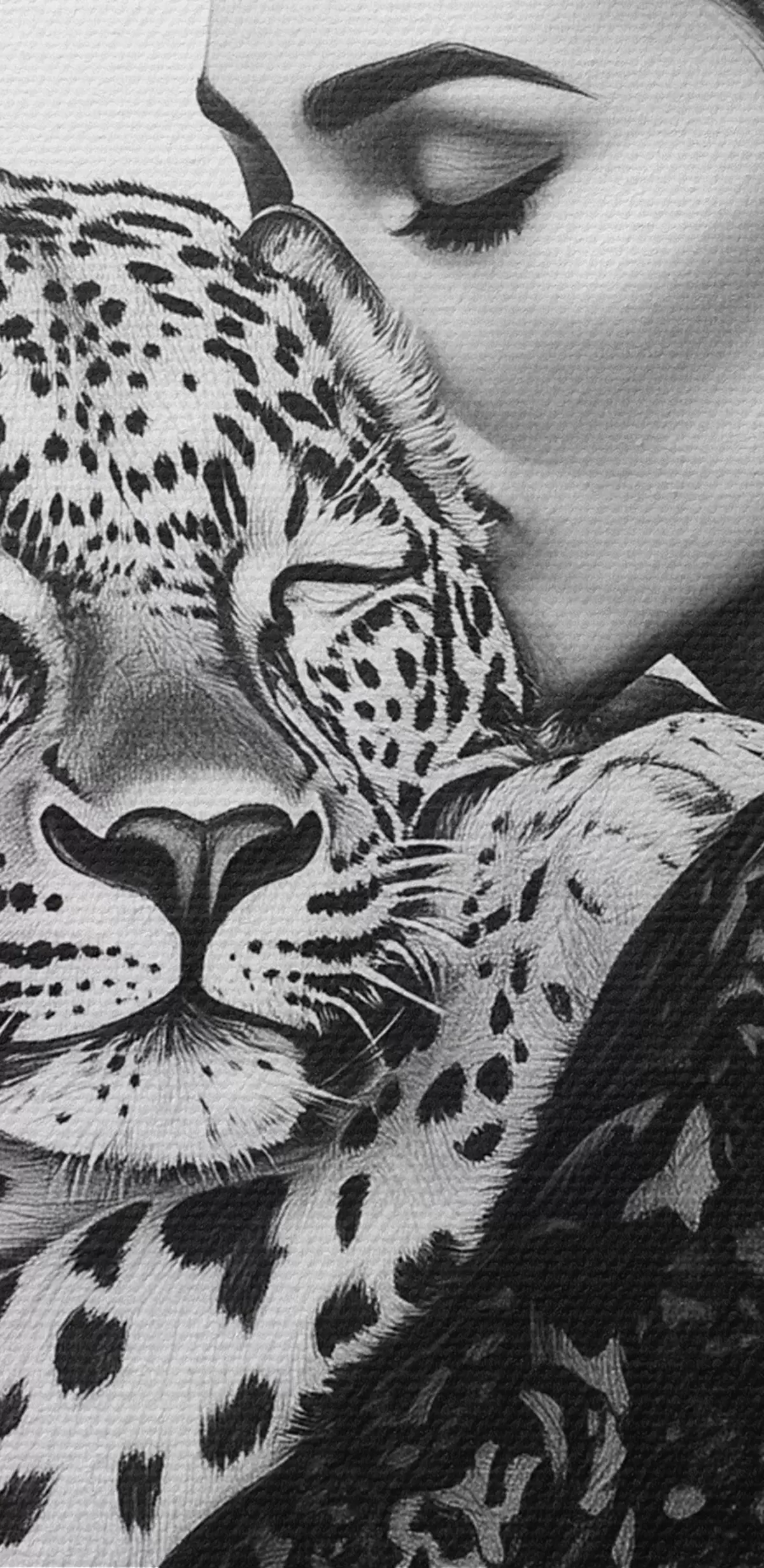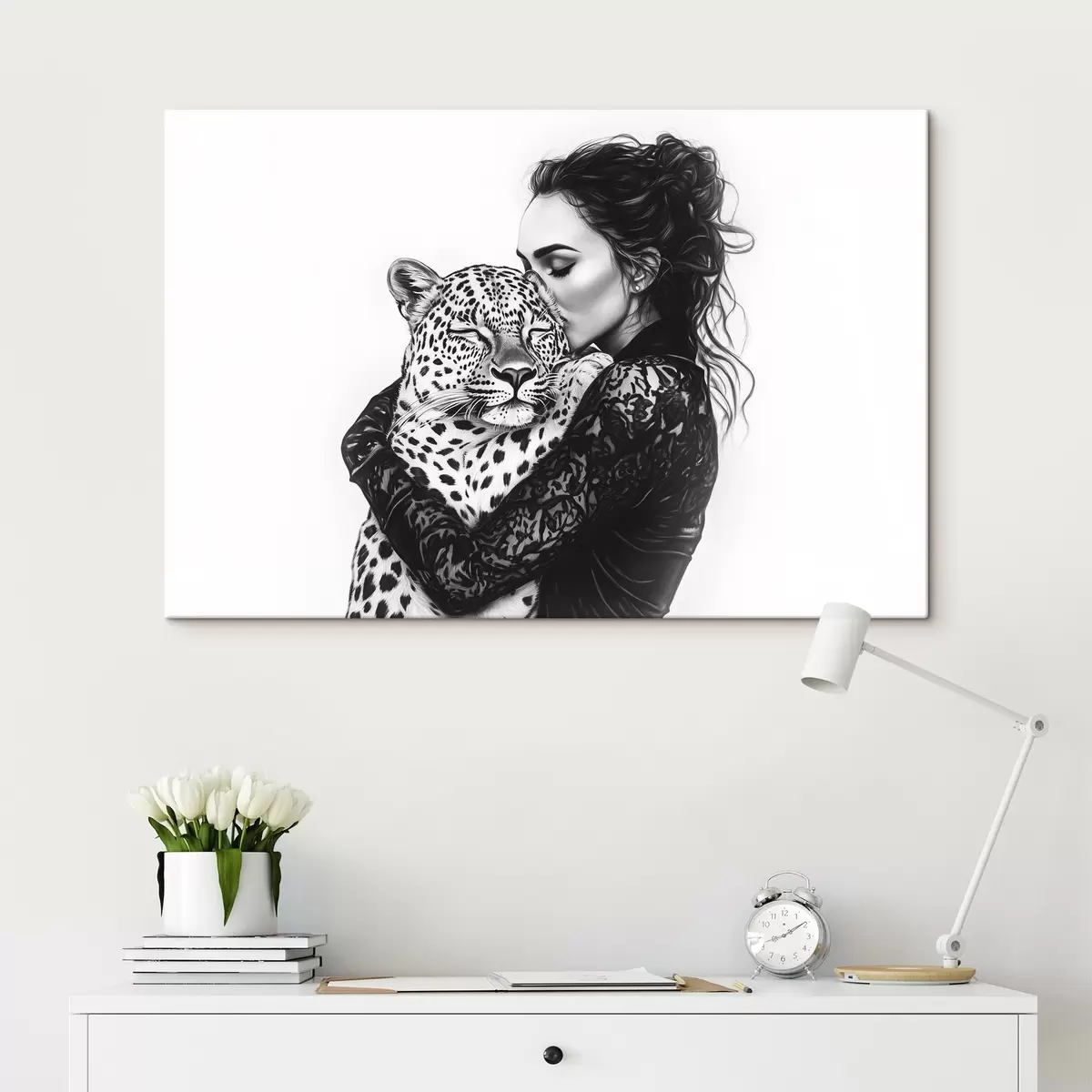 Obraz Kobieta całująca lamparta, rysunek ołówkiem, dzikie zwierzęta, czarno-biały s41457
