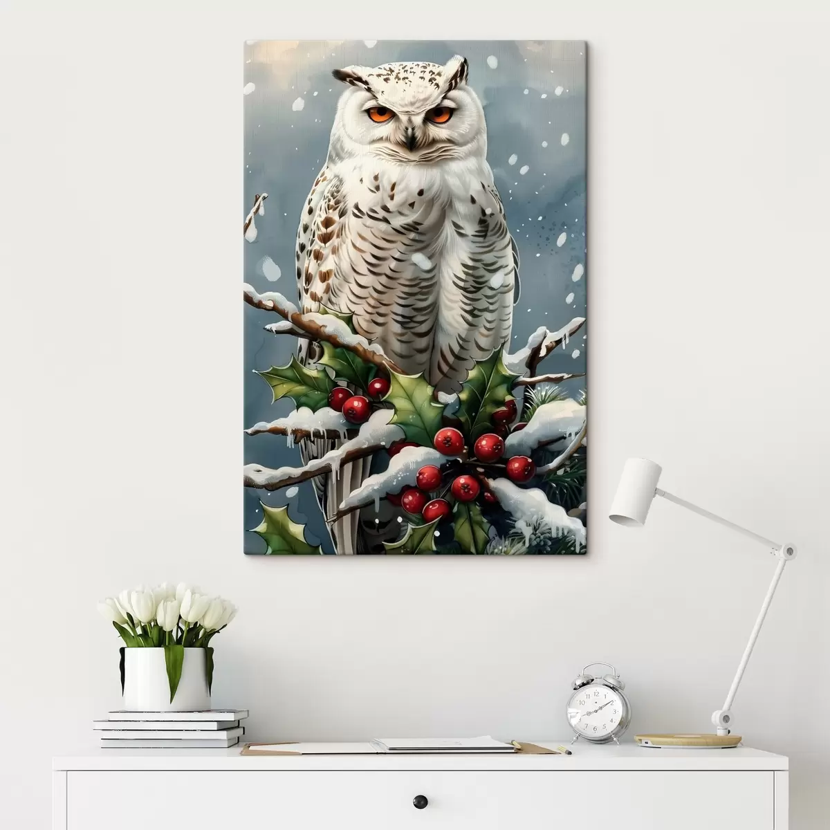 Obraz Sowa na zimowej gałęzi z jagodami i liśćmi Nr s41482