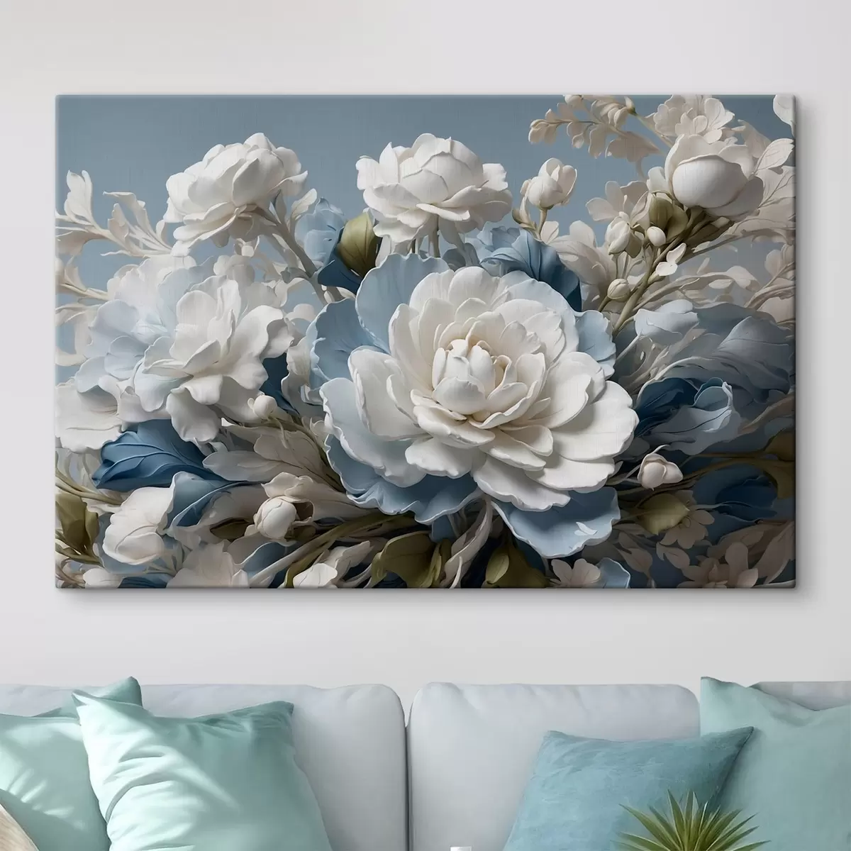 Obraz Białe kwiaty i liście na niebieskim tle Nr s41527