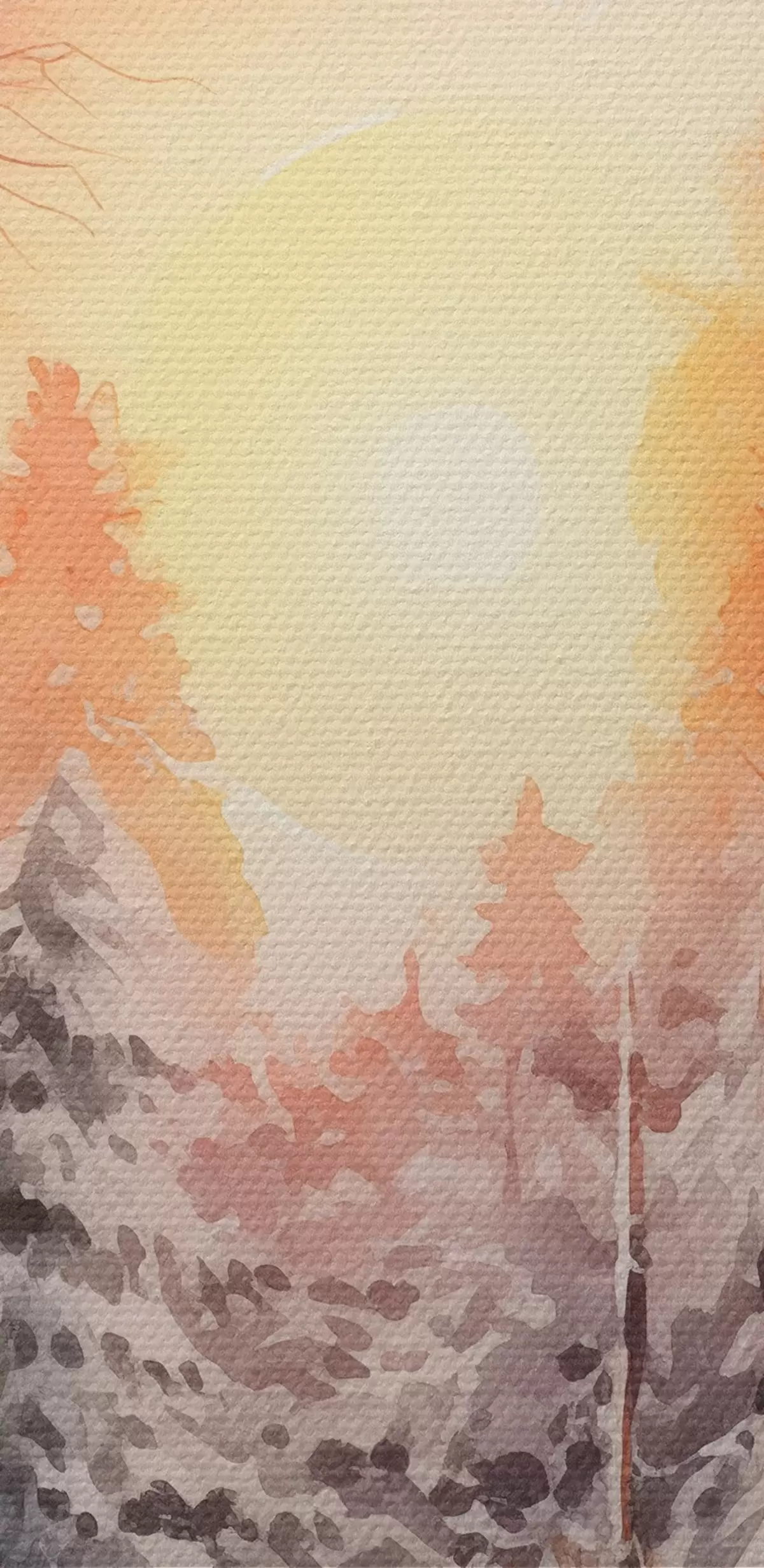 Obraz Piękna zima, akwarela las, śnieżny, drzewa, różowe niebo, zachód słońca s41641
