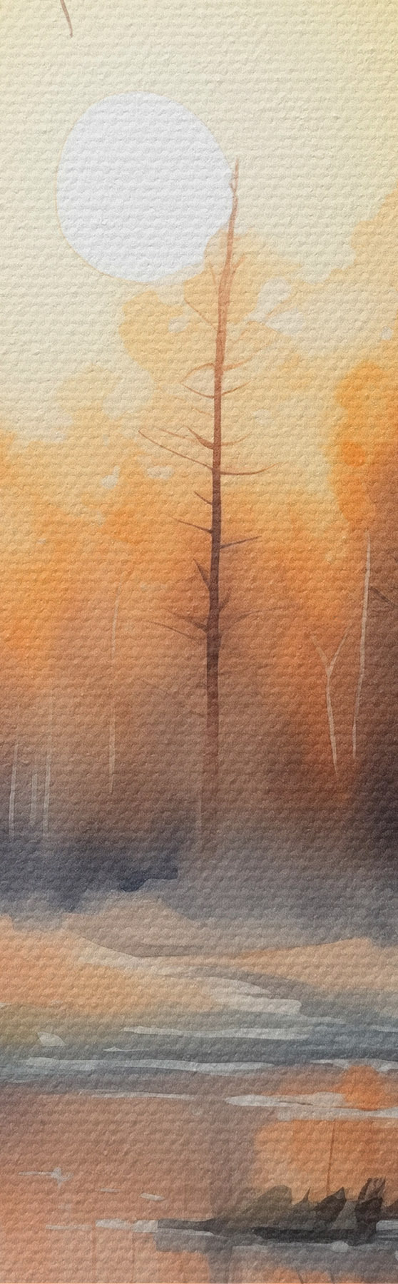 Obraz Jezioro w lesie, akwarela, jesienne kolory, mgła, niebo o zachodzie słońca Nr s41642
