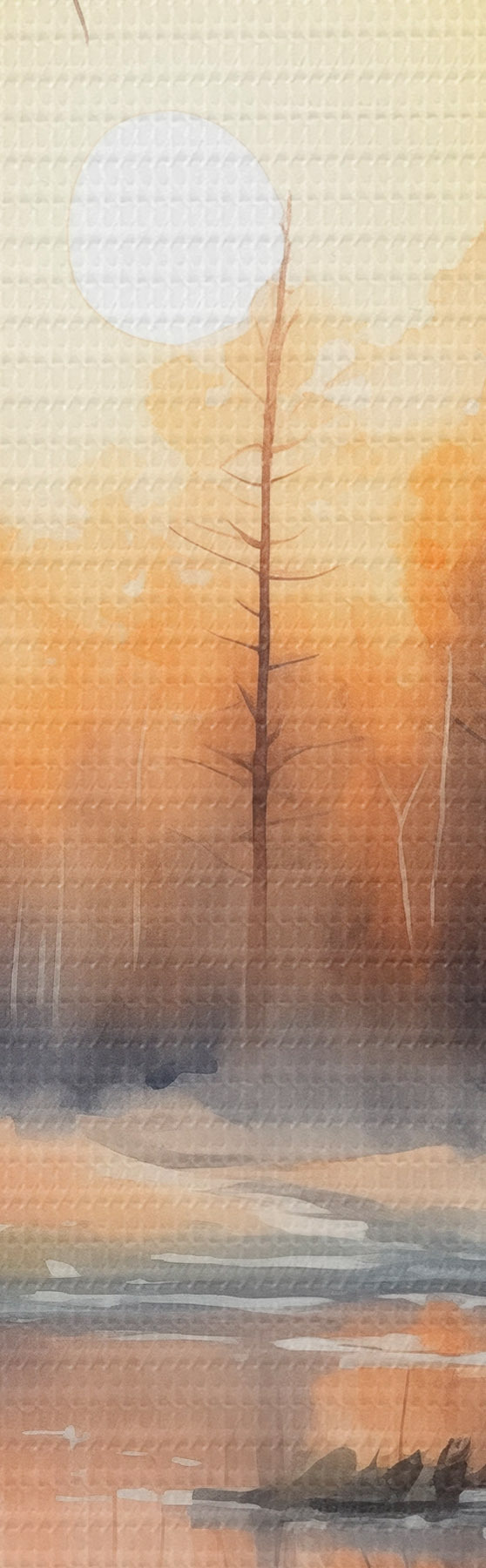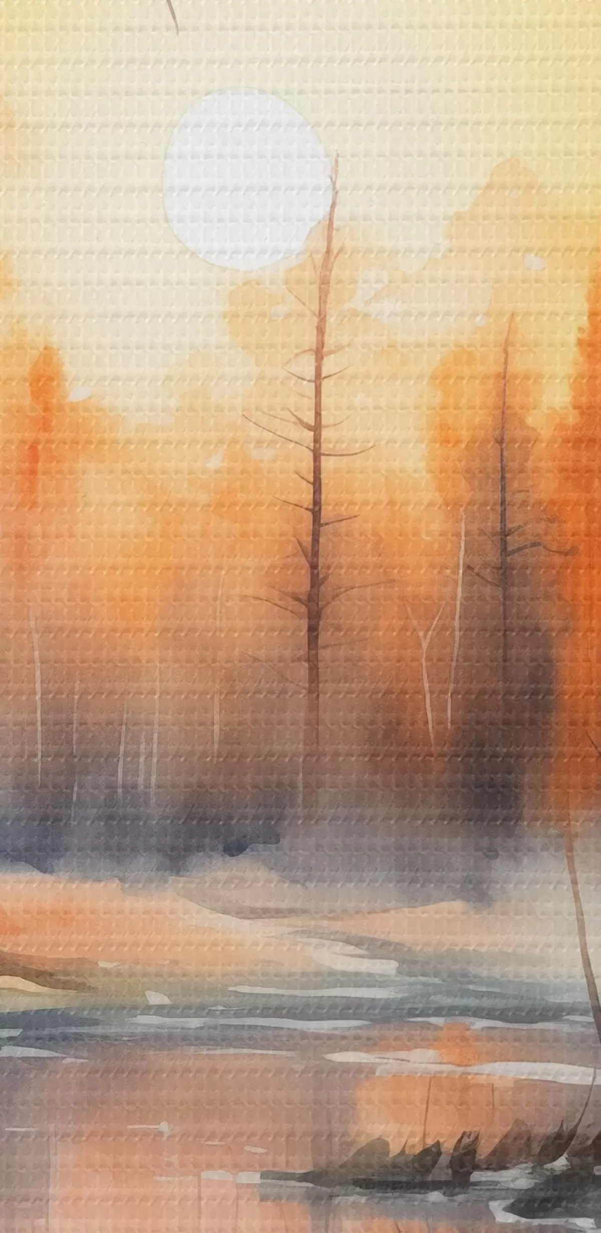 Obraz Jezioro w lesie, akwarela, jesienne kolory, mgła, niebo o zachodzie słońca s41642