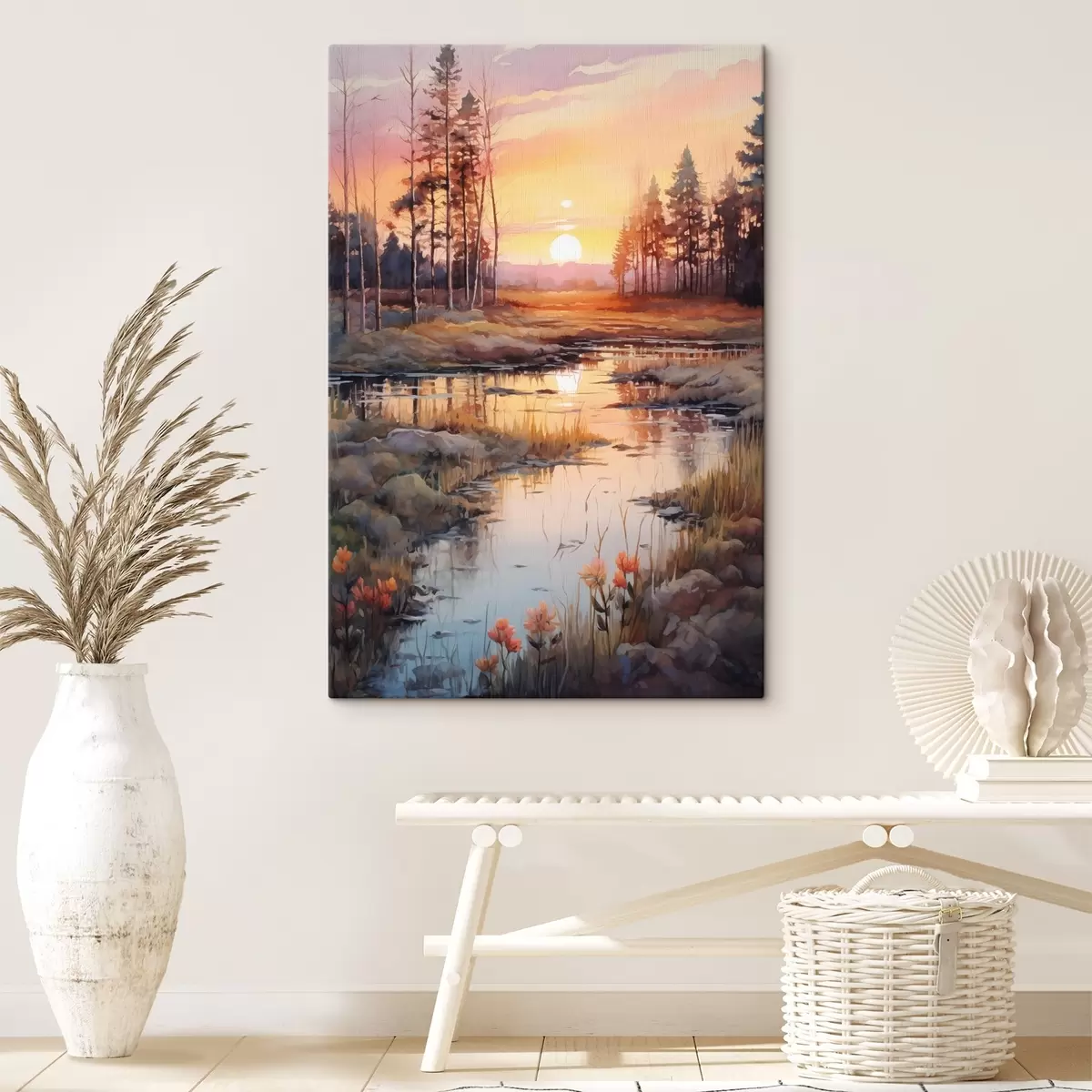 Obraz Piękna rzeka w jesiennym lesie, akwarela, łąka, niebo o zachodzie słońca Nr s41643