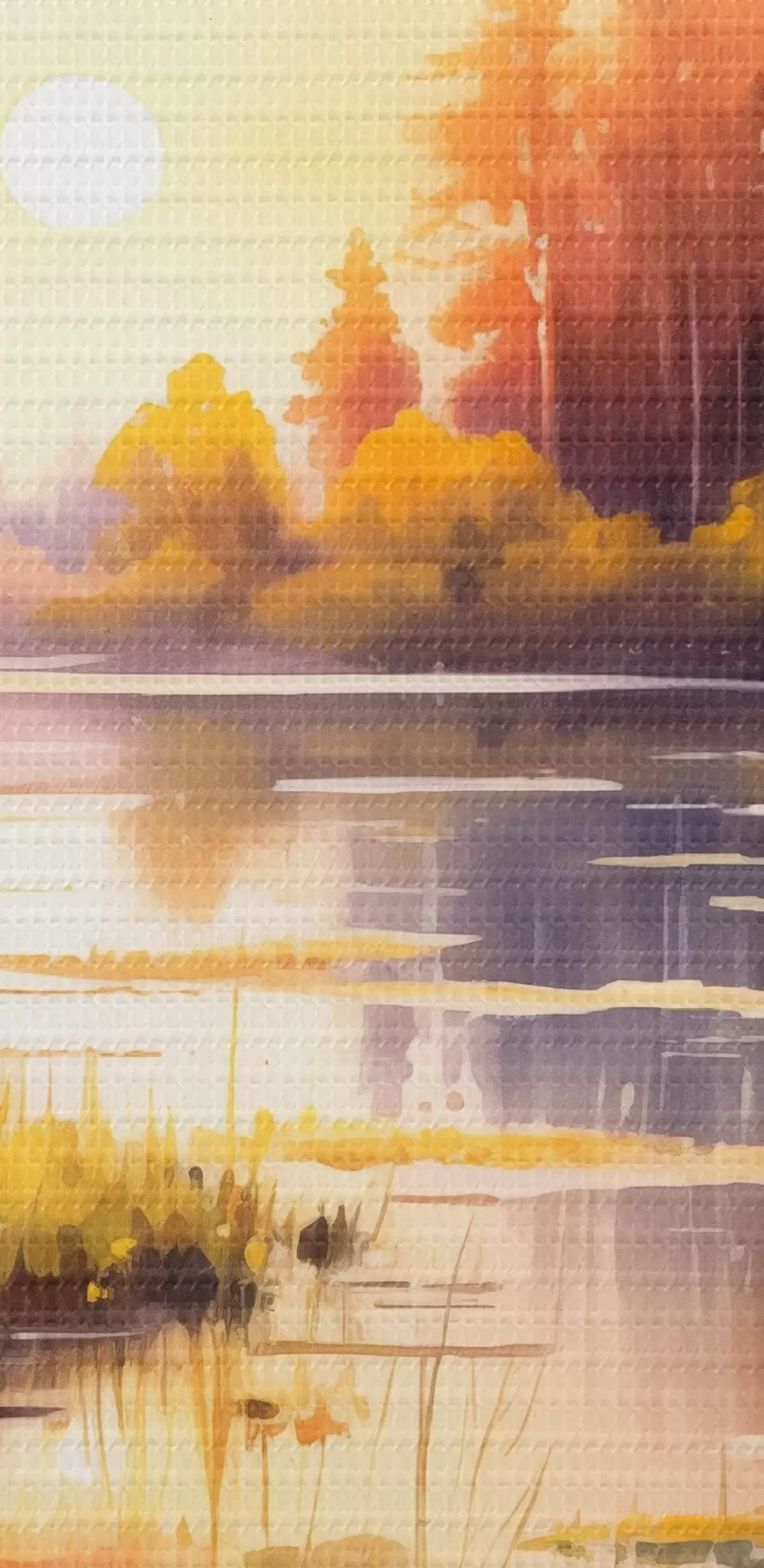 Obraz Wschód słońca nad leśnym jeziorem, akwarela, drzewa, kwiaty, delikatne światło s41644