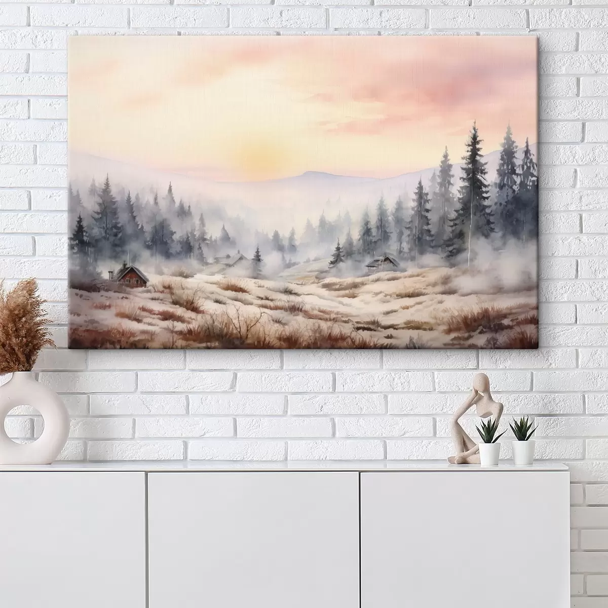 Obraz Karpaty, mroźny las, wieś, drewniane domy, wschód słońca Nr s41647