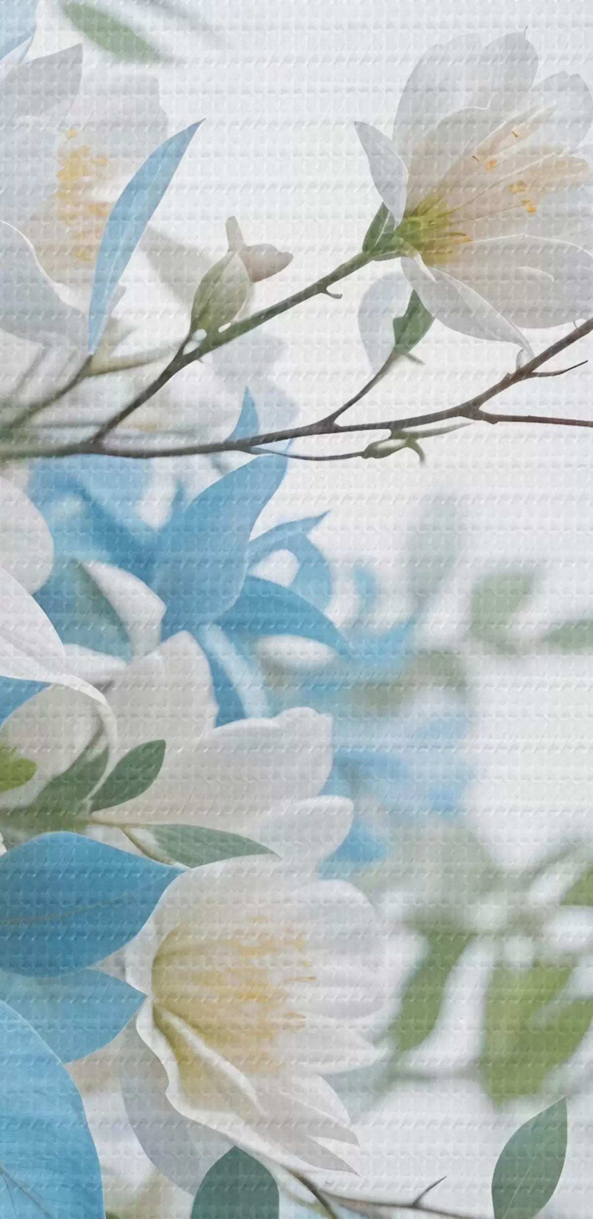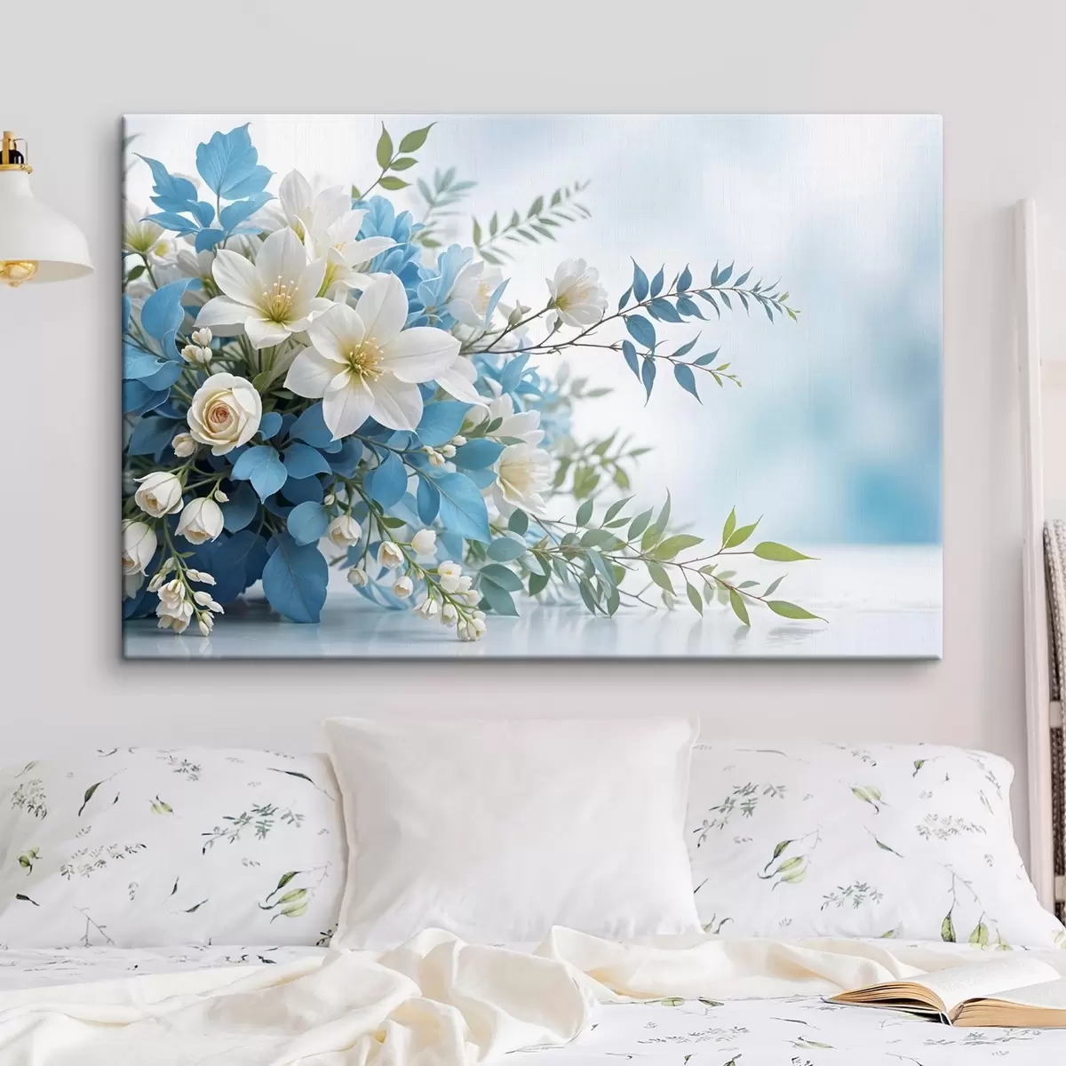 Obraz Bukiet białych i niebieskich kwiatów z zielonymi liśćmi na miękkim, rozmytym tle Nr s41715