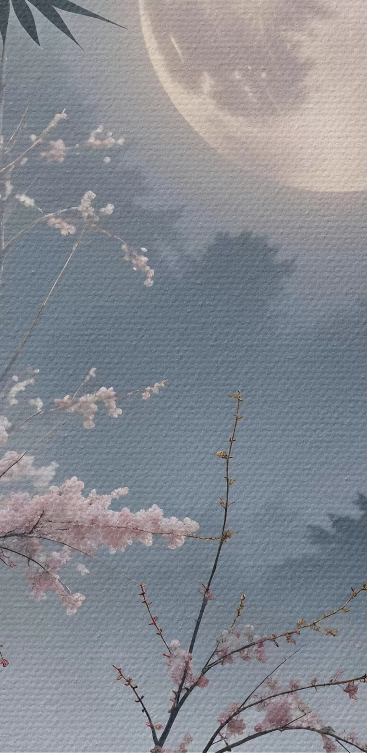 Obraz Księżyc w pełni na nocnym niebie, otoczony sylwetkami drzew bambusowych i gałęziami kwiatów wiśni  s41717