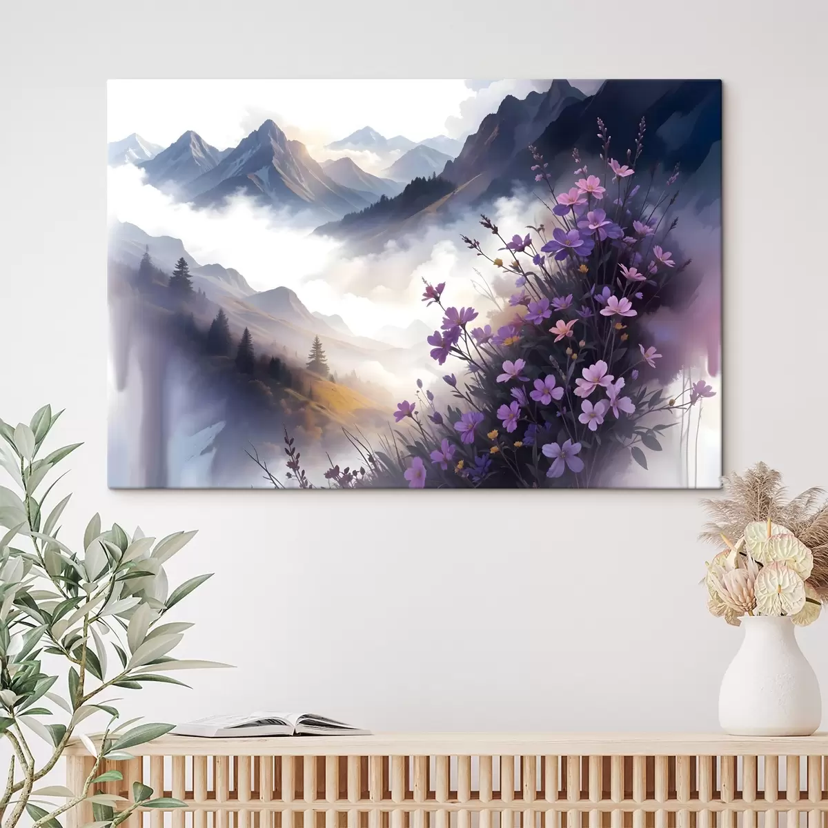Obraz Krajobraz z pasmem górskim w tle, otoczony bujnymi fioletowymi kwiatami na pierwszym planie Nr s41724