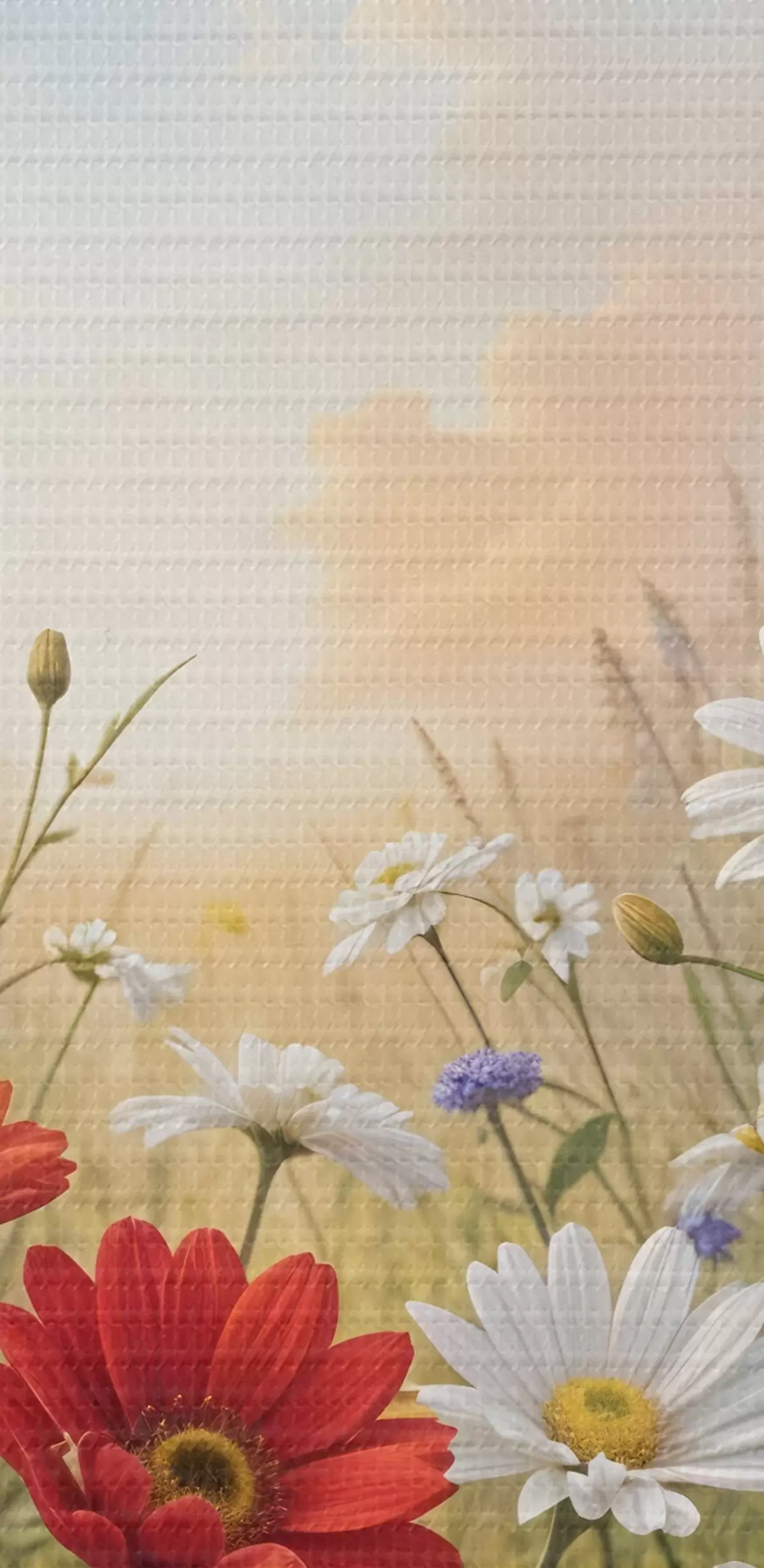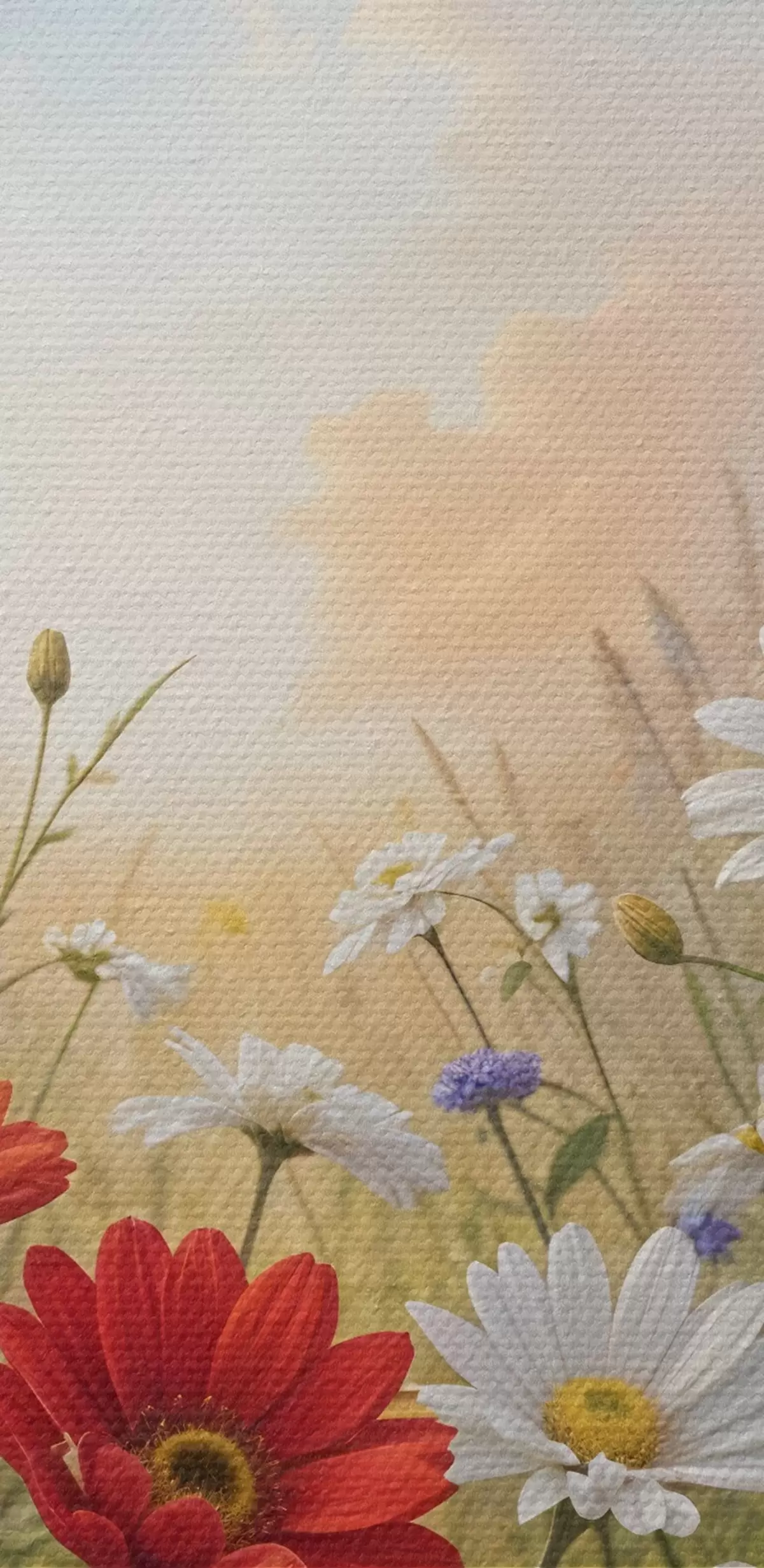 Obraz Pole kolorowych polnych kwiatów, w tym stokrotek, maków i innych kwitnących roślin na tle błękitnego nieba  s41725
