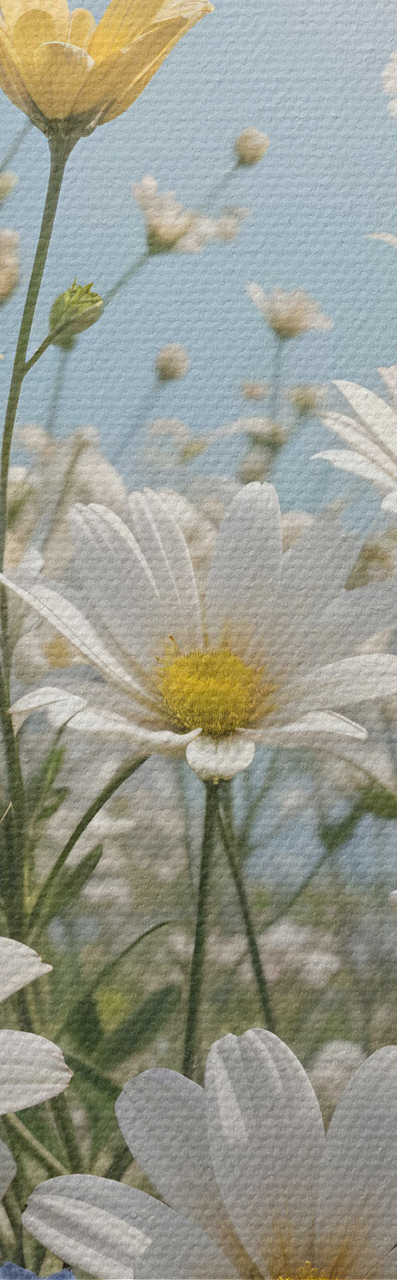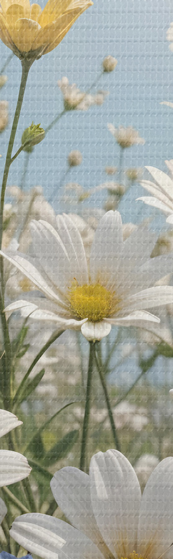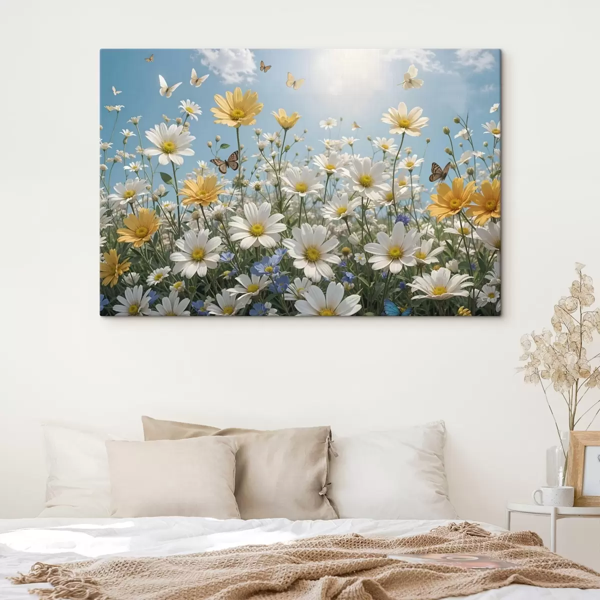 Obraz Pole białych i żółtych stokrotek na tle błękitnego nieba z puszystymi białymi chmurami i latającymi nad nimi motylami Nr s41726