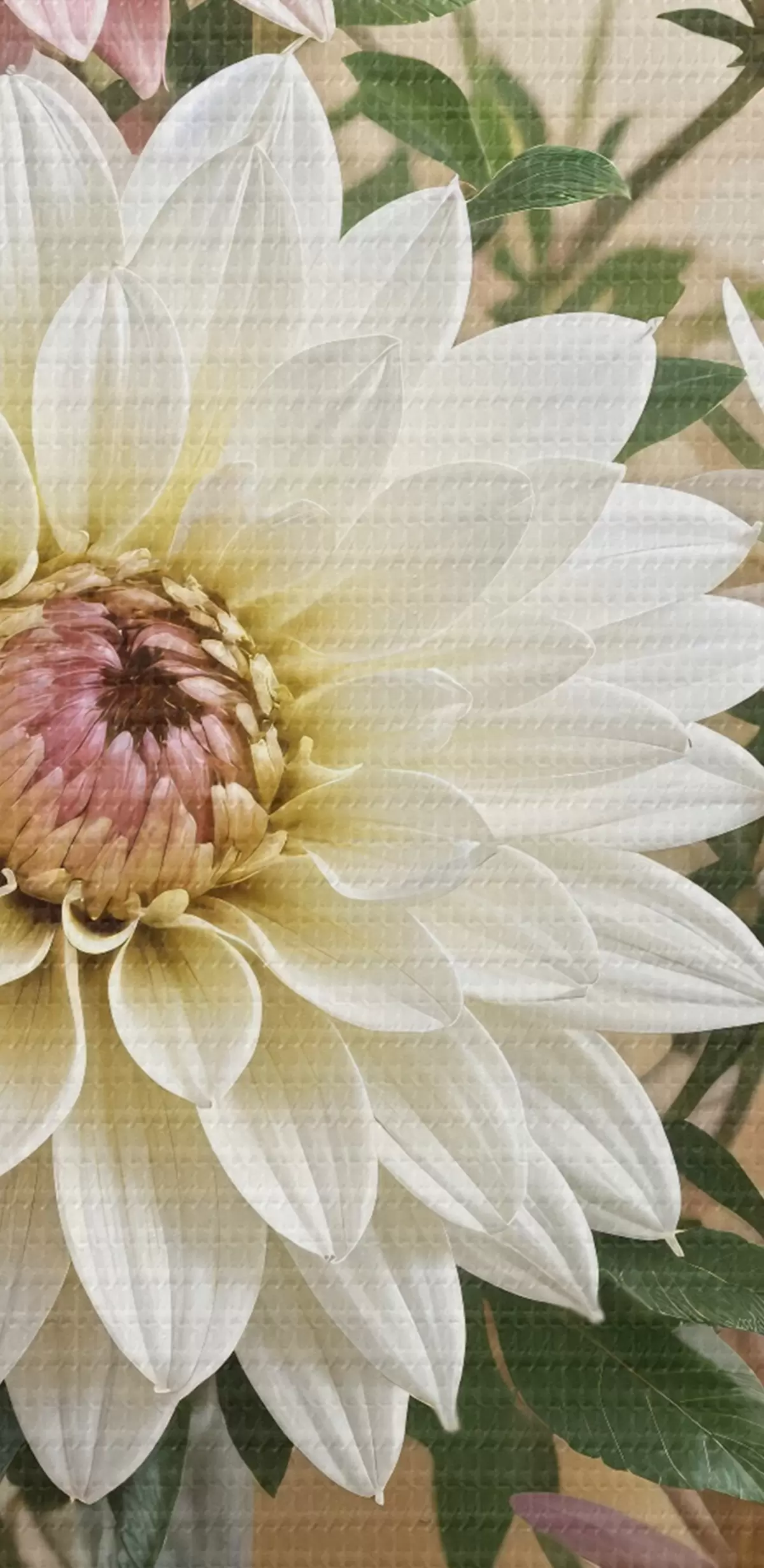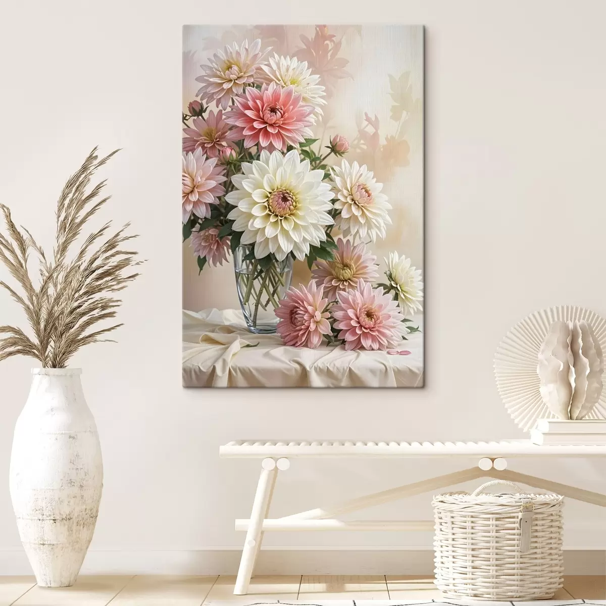 Obraz Bukiet dużych różowych i białych kwiatów dalii w szklanym wazonie na delikatnym różowym tle Nr s41743