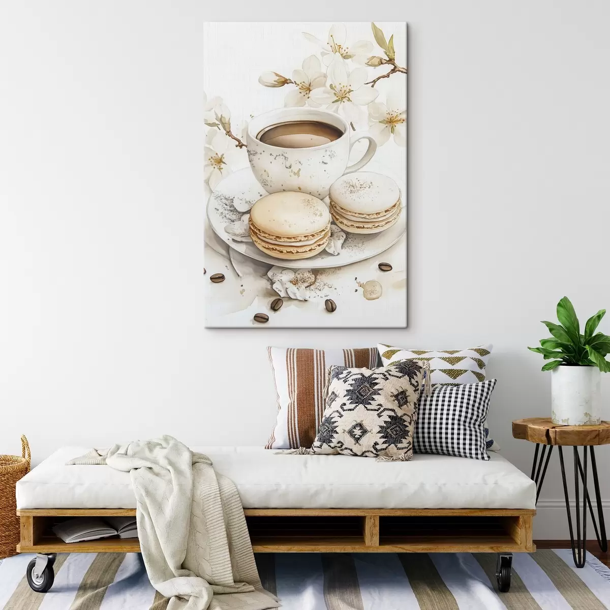 Obraz Filiżanka kawy z makaronikami, styl akwareli, delikatne kolory, kwiaty jaśminu Nr s41949