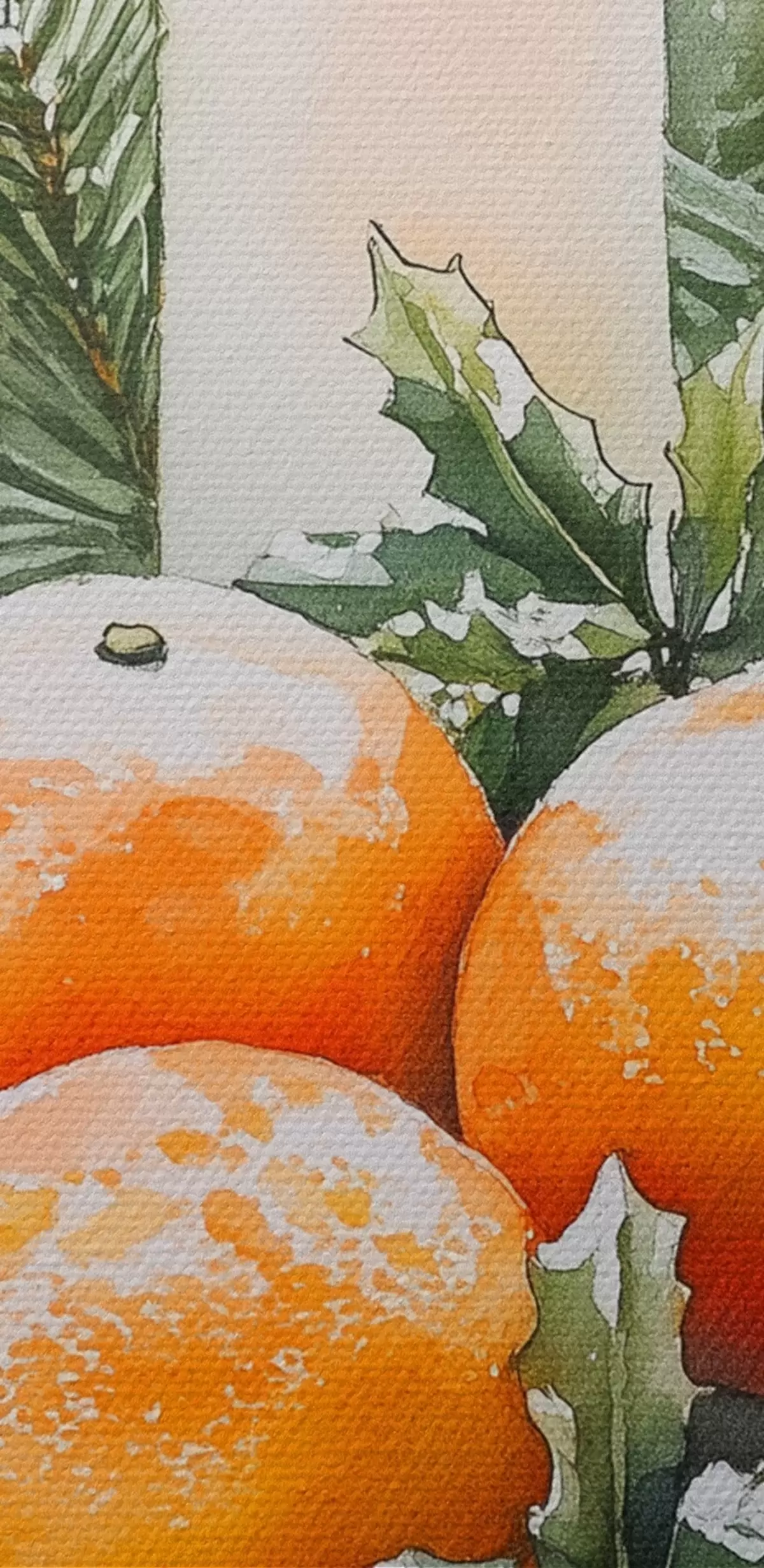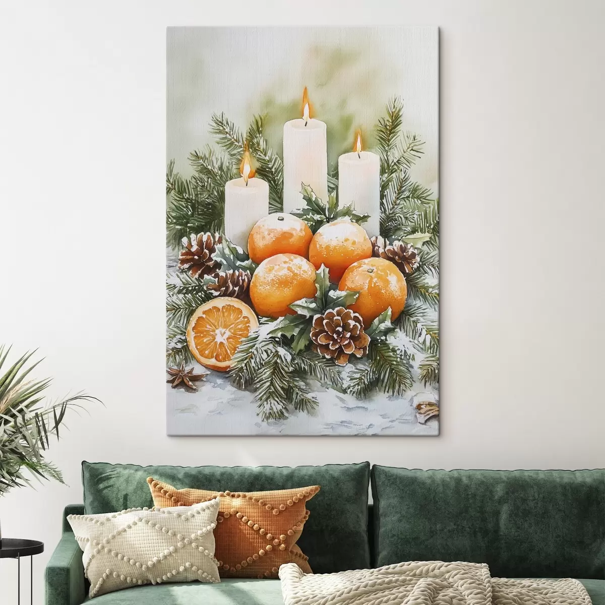 Obraz Świąteczny wystrój ze świecami, sosną, szyszkami i pomarańczami, styl akwareli s41951