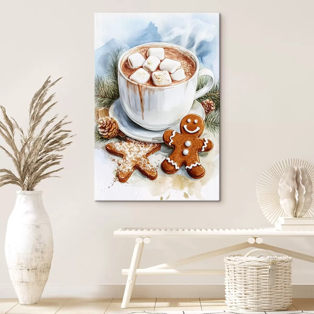 Obraz Kubek kakao z piankami, piernikowe ludziki, ciasteczka, sosny z szyszkami s41952